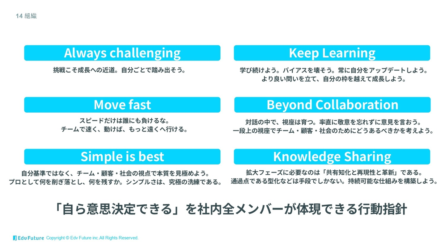 その組織を体現するための行動指針が、「Always challenging」「Move fast」「Simple is best」「Keep Learning」「Beyond Collaboration」「Knowledge Sharing」という6つのバリューです。