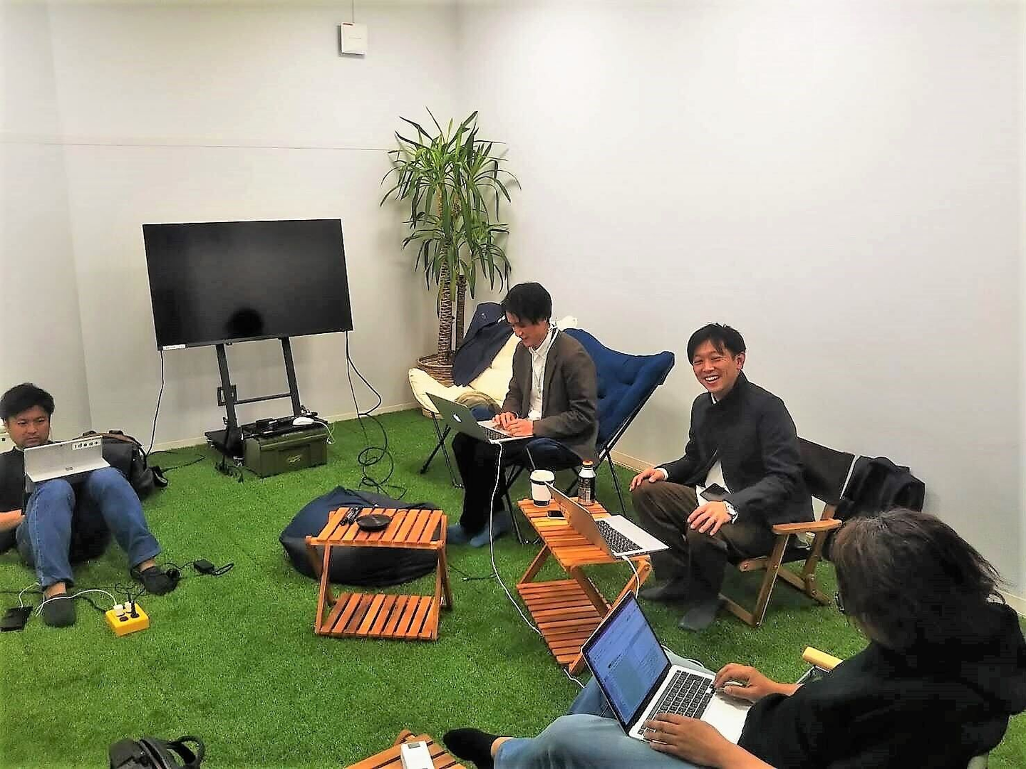 メンバーと打ち合わせを行う清水(右から2人目)。みんな靴を脱いでリラックスしています。