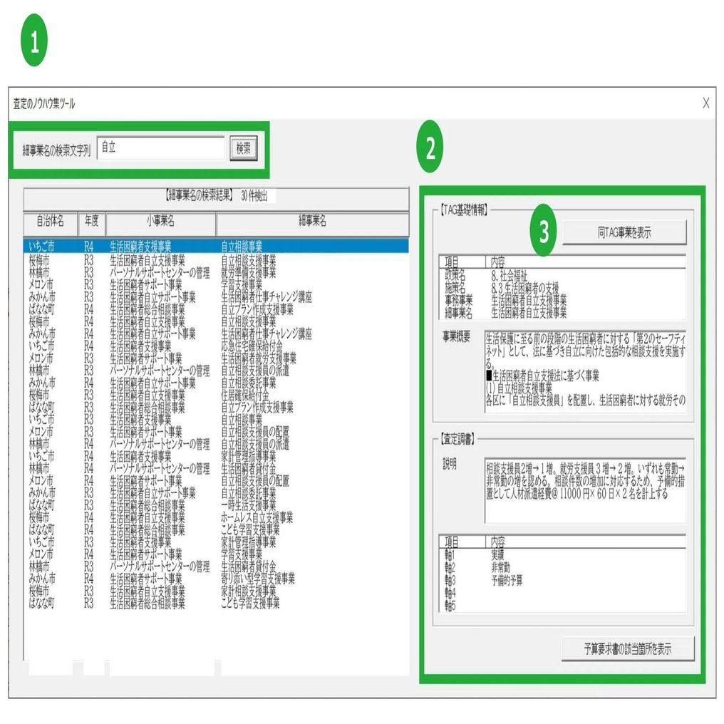 自治体独自、あるいは職員独自の経験と勘に頼っていた予算査定のノウハウを暗黙知から形式知化したツール。TAGと軸の組み合わせによる事業類似性の特定から、年度間・自治体間比較が可能。