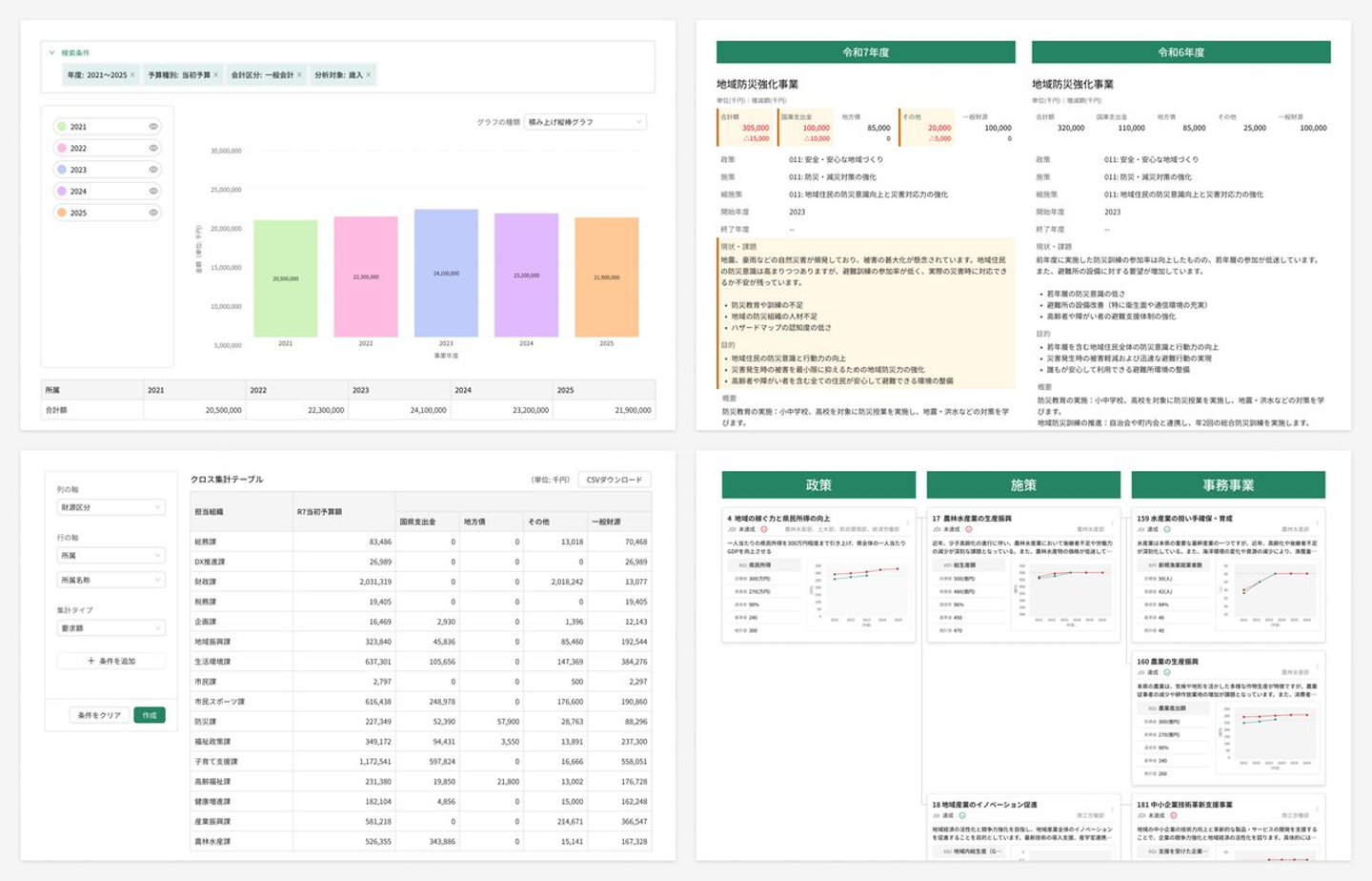 左上:分析機能、右上:差分比較機能、左下:クロス集計機能、右下:政策体系機能の各デモ画面