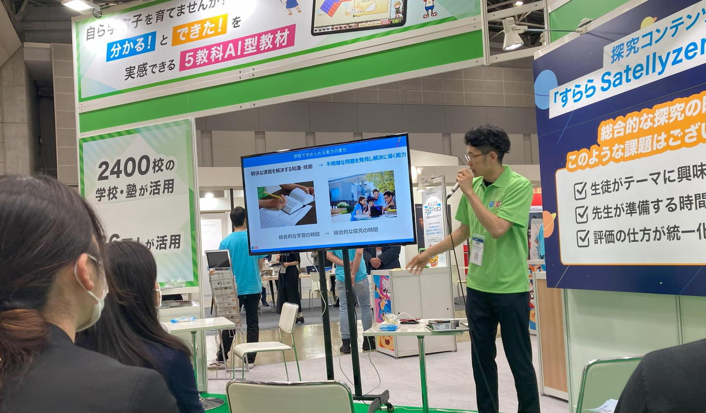 展示会には、学校や教育委員会の関係者の方や、塾経営に携わる方、開業を検討中の方、教材やシステムの開発業者の方など、教育に携わる様々な方々が来場します。そんな来場者の方々に、少しでもすららネットの教材や事業活動を知ってもらい、教育業界で皆様が感じている課題にすららネットができることをお話させていただきます。