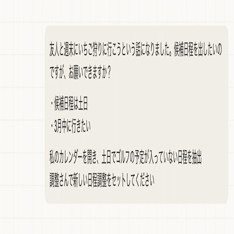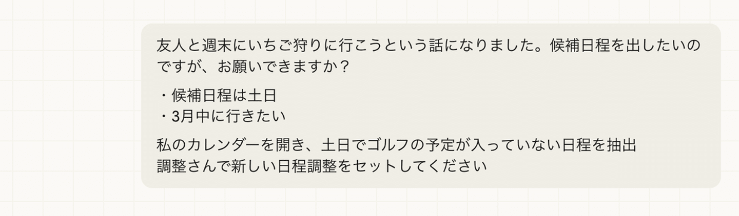 その日程調整も正直自分のカレンダー見ながら一つずつやるのも正直億劫になってきたんですよね。秘書さんにお願いするのも完全に業務上のお願いとも言い切れないケースもあるので、なんとかAIで自動化したいなと思ったら、10分でできたので、皆さんに共有させていただきます。