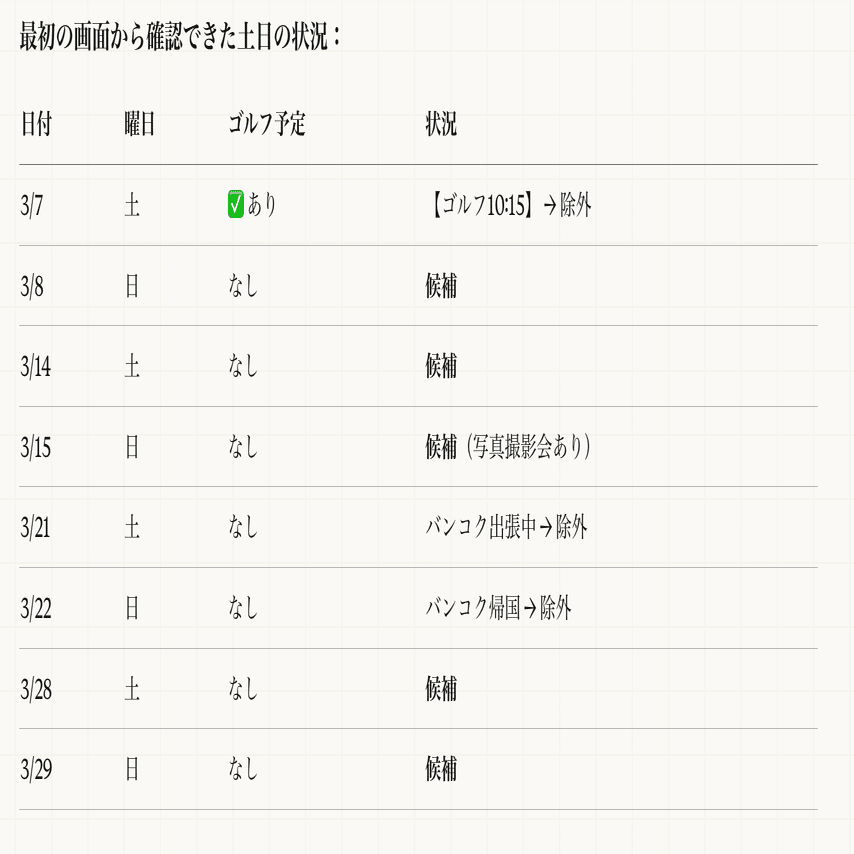 この先も自動でどんどん進みます。(ちなみに3月の週末は、全部ゴルフでカレンダーが埋まっていたので一時的にいくつか削除してます。)