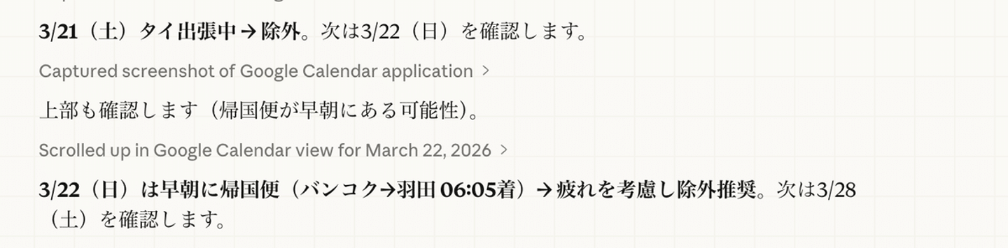ちなみに、除外というのは海外出張で朝戻ってくることを配慮してくれるのかを実験したかったのでそのまま入れておきましたが、しっかり配慮されました。