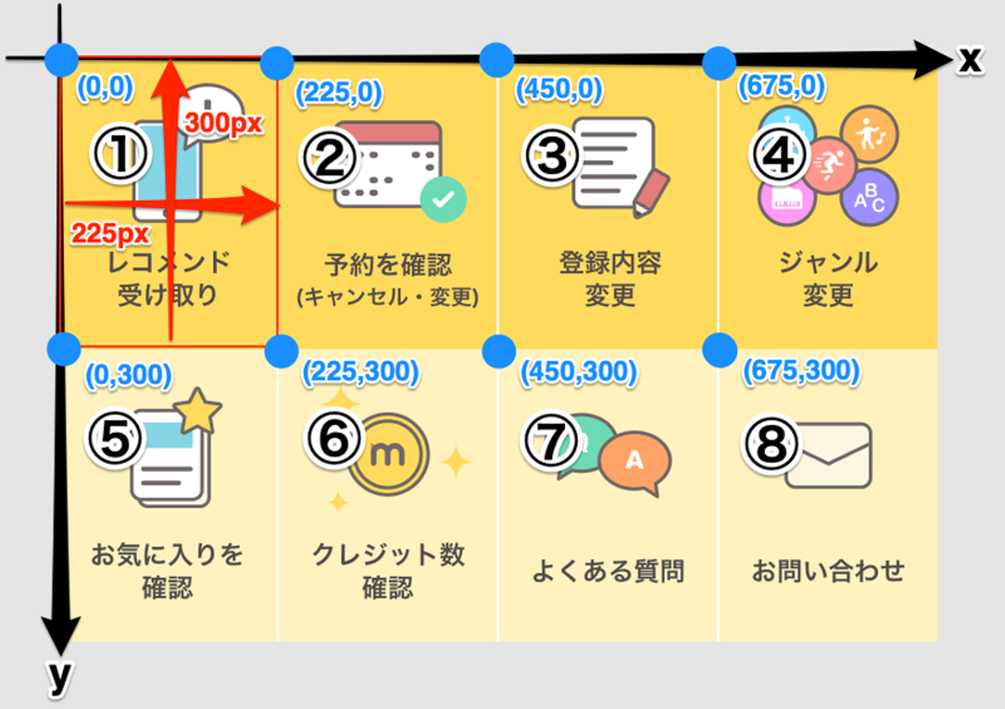`x`と`y`は座標を指しています。座標は以下のように左上を(0, 0)とします。そして、①から順番に`bounds`を指定していきます。