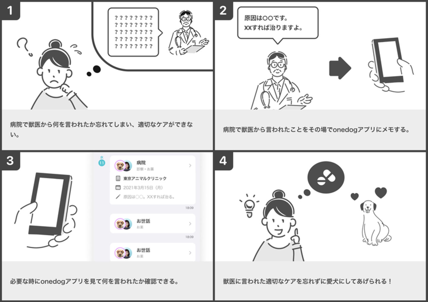 下記はストーリーボードの一例です。「onedogにうんちの記録をすることで獣医師に症状を的確に伝えることができるようになり、適切な治療を受けることができるようになった」というユーザー体験を説明しています。