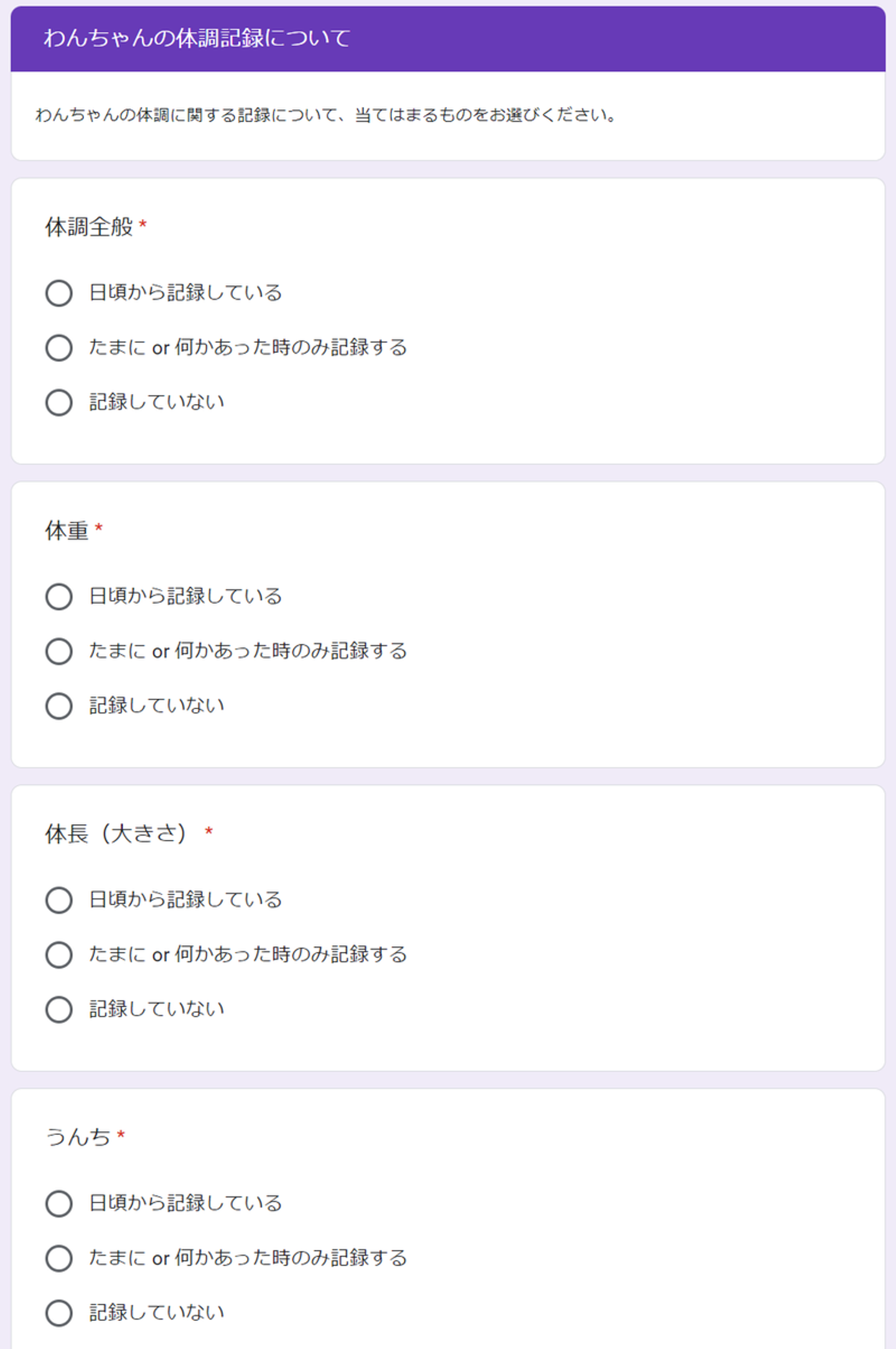 下記はアンケートの一例です。インタビューにてユーザーが「記録したい」もしくは「記録しない」と回答した項目について、実際にどのくらいのユーザーが記録するのか、アンケートで収集しました。