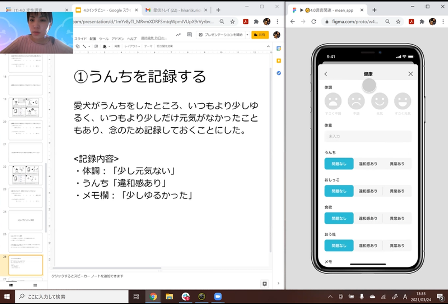本来であれば、実際にインタビュイーにプロトタイプを触ってもらって、スムーズに行えていたか、どこでつまづいていたかなど、インタビュイーの様子を見て検証するのですが、今回はオンラインでのインタビューだったので少し方法を変えて実施しました。