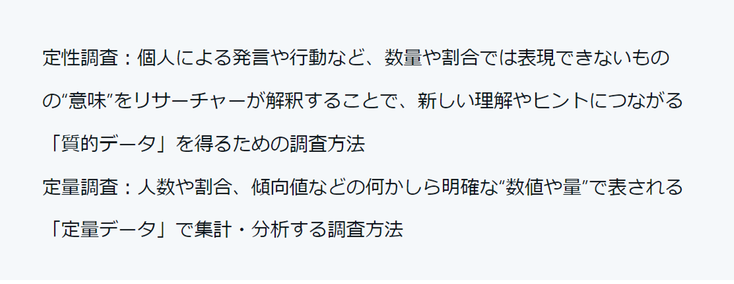 インタビューによる定性調査と、アンケートによる定量調査を組み合わせて実施しました。