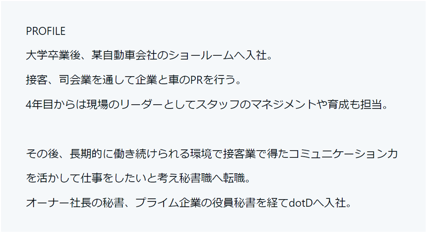 dotDへ入社するまでは秘書として約4年キャリアを積んでいます。