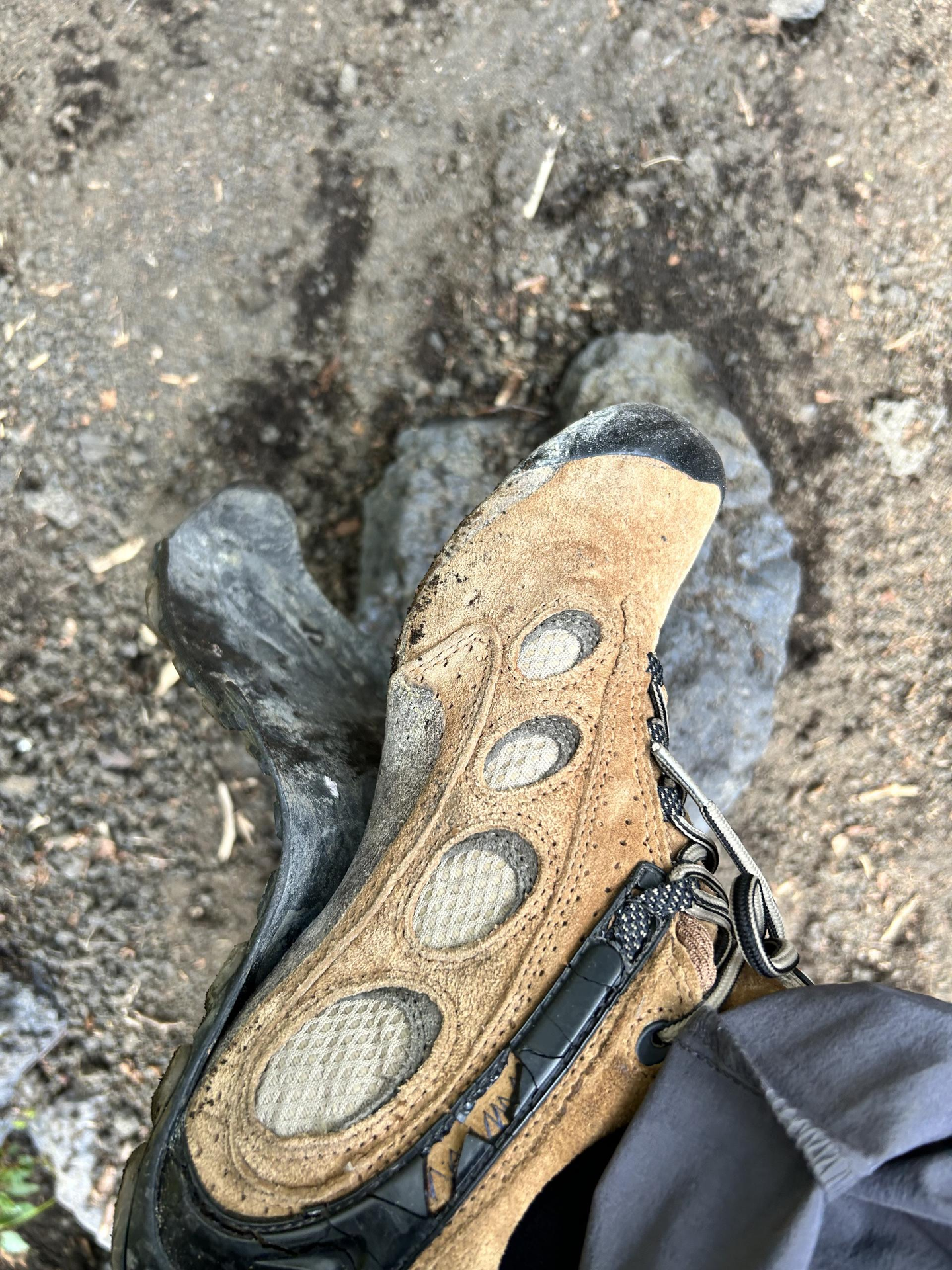 (河下さんのトレッキングシューズには靴底が剥がれぬようにテーピングがぐるぐる巻きにされてます)