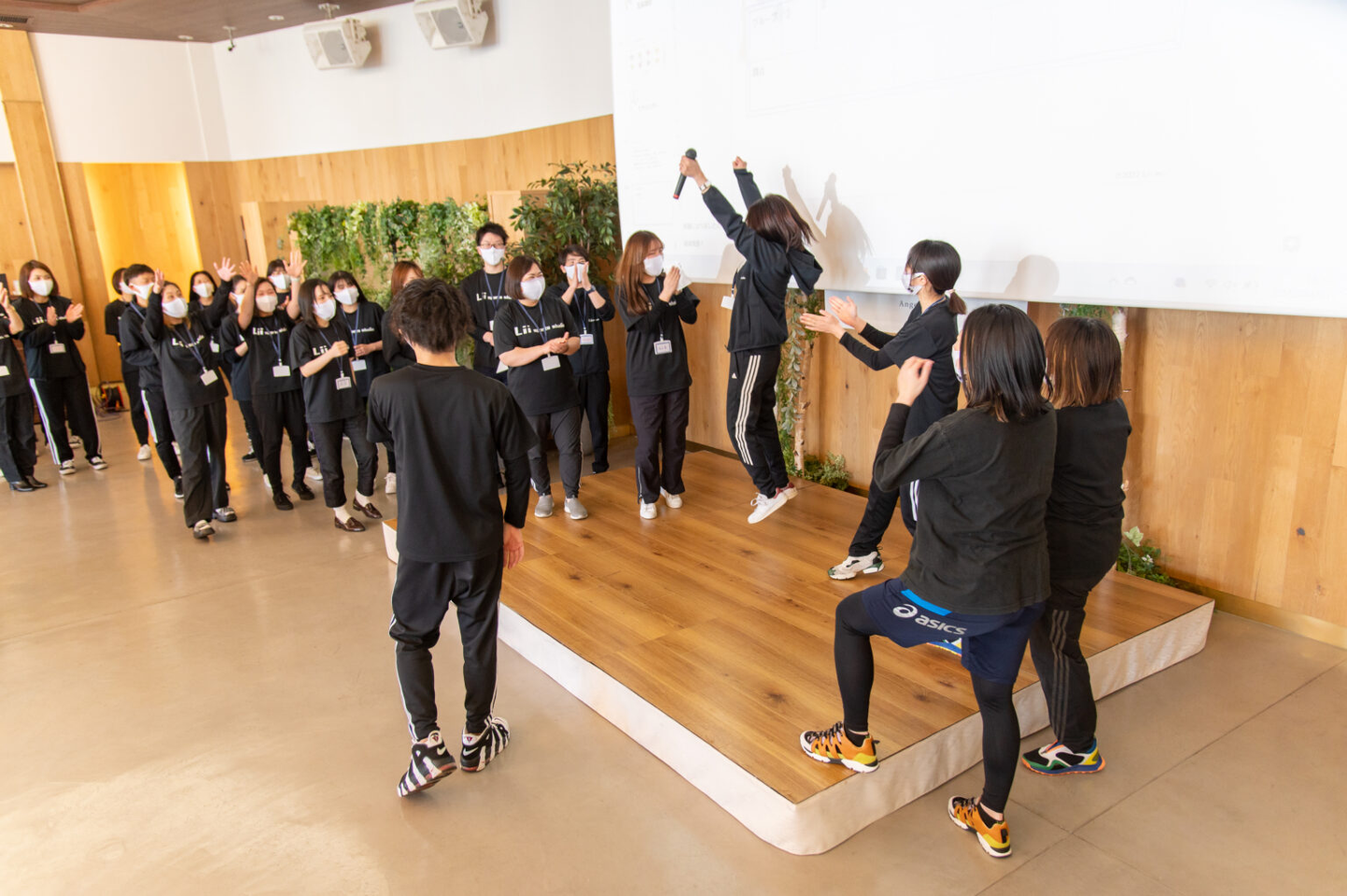 半期に一度の全社会議を開催しているのですが、通常会議となると座って話を聞くという形が主流となっていました。しかし、全社会議の目的が会社への幸福実感・ロイヤリティ向上を目指していた為、2023年4月の会議は座らない入社式・全社会議として、午前中は、体を動かして心拍数を上げる、シャトルランやチャンパラ等の運動を行った後にワーク等を行う形に変更し、“座らない入社式・全社会議”を開催しました。