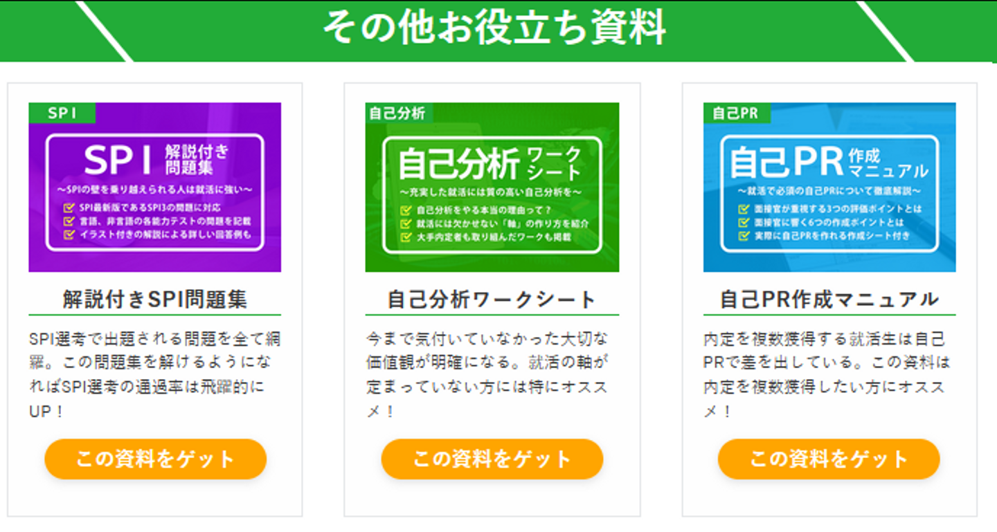 SPI、自己分析ワークシート、自己PR、最終面接、就活スケジュール、職種一覧、就活グッズ、敬語マニュアル、インターン用資料