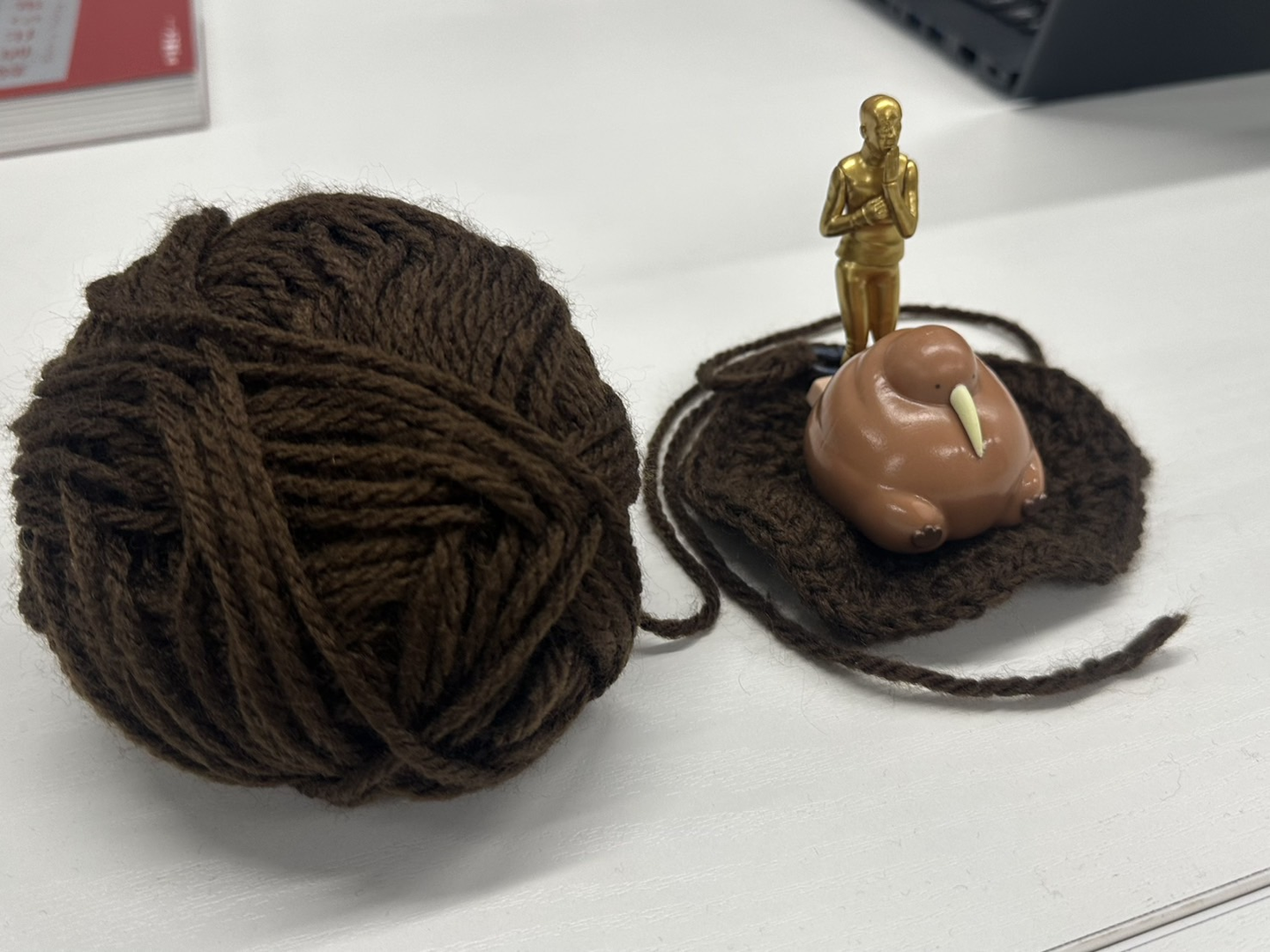 オフィスにあるキウイ(鳥)のぬいぐるみの座布団を編んでいます(笑)
