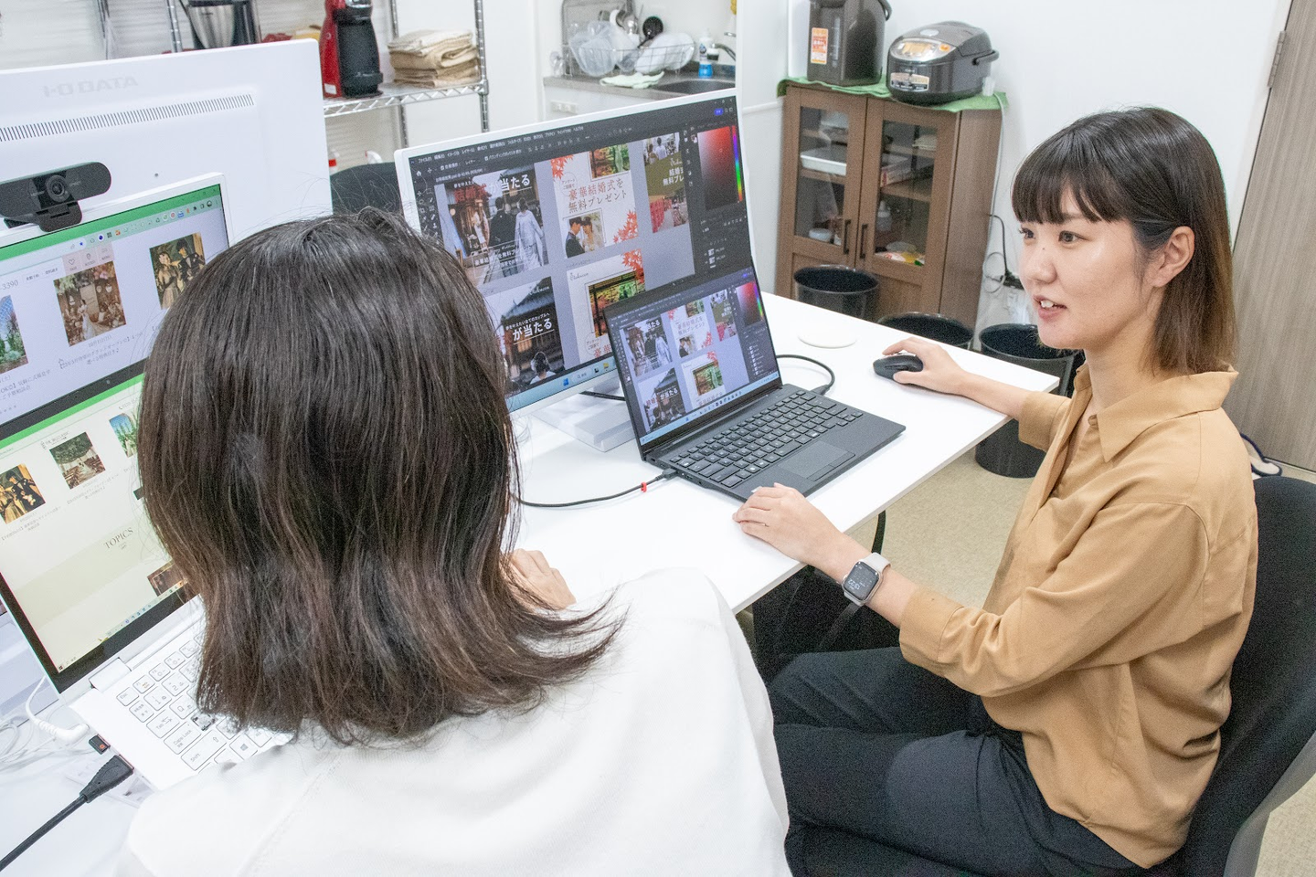 現在はWEBデザイナーとして関連会社であるベルコのオフィシャルサイトの更新、広告バナーの作成、公式LINEのデザインなどを担当している。