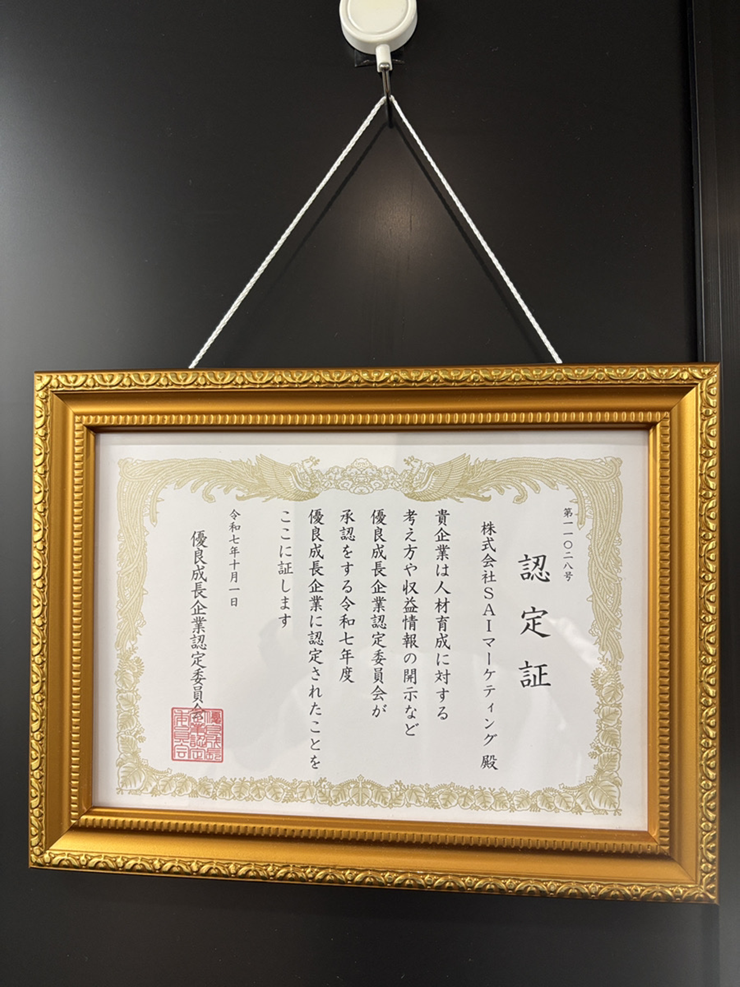 先日、SAIマーケティングは「優良成長企業」に認定していただきました!今回、実際に働く皆さんのリアルな声を聞かせていただきたく、この場を設けました。この認定は、外部からの客観的な評価として非常に大きく、会社の成長を改めて実感する機会となりました。