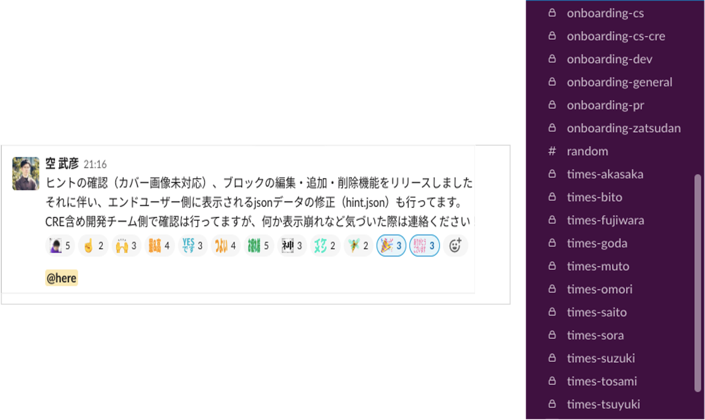 業務に関する連絡とは別に個人チャンネルもあり、気軽につぶやきや質問が可能です!