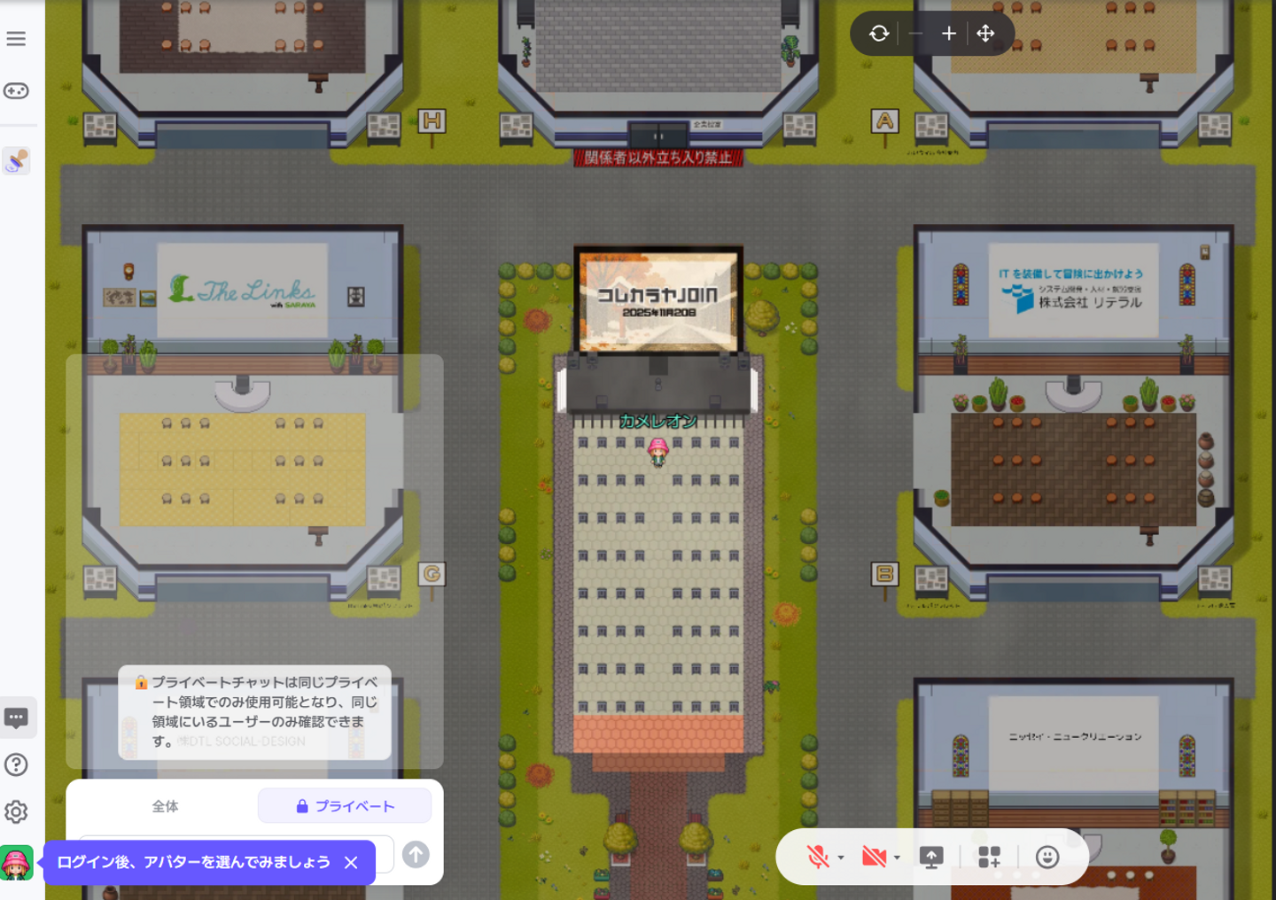求職者はキャラクターを操作して企業ブースへ入り、担当者から直接説明を聞いたり質問したり。