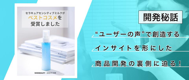 みなさんこんにちは!株式会社CORESの新人広報担当です。秋が終わりを迎え、寒い冬の季節がやってきましたね。そんな季節にぴったりな新しいコーナーを持ってまいりました!その名も…「聞かせて!CORESの開発ストーリー」冬になると、急に乾燥が気になる方もいらっしゃるのではないでしょうか。そこで、乾燥といえば...?保湿!といえば...? そう!乳液ですよね?笑今回は「センシティブミルク(乳液) - CeraLabo編」と題しまして、昨年末に「WWD BEAUTY 2023下半期ベストコスメ」を受賞した製品についての開発秘話をお届けします。(乳液・クリーム部門の「バラエティー・ドラッグストア」...