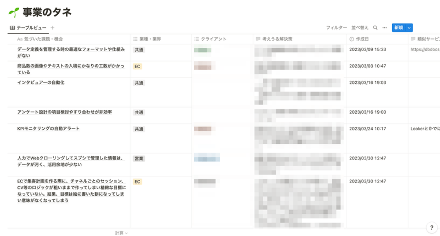 下記のnotionテーブルが「事業のタネ」制度の実際のアイデアリストになります。社員が感じた課題が記載されており、この中から検討フェーズに入った事業アイデアもいくつかあります。