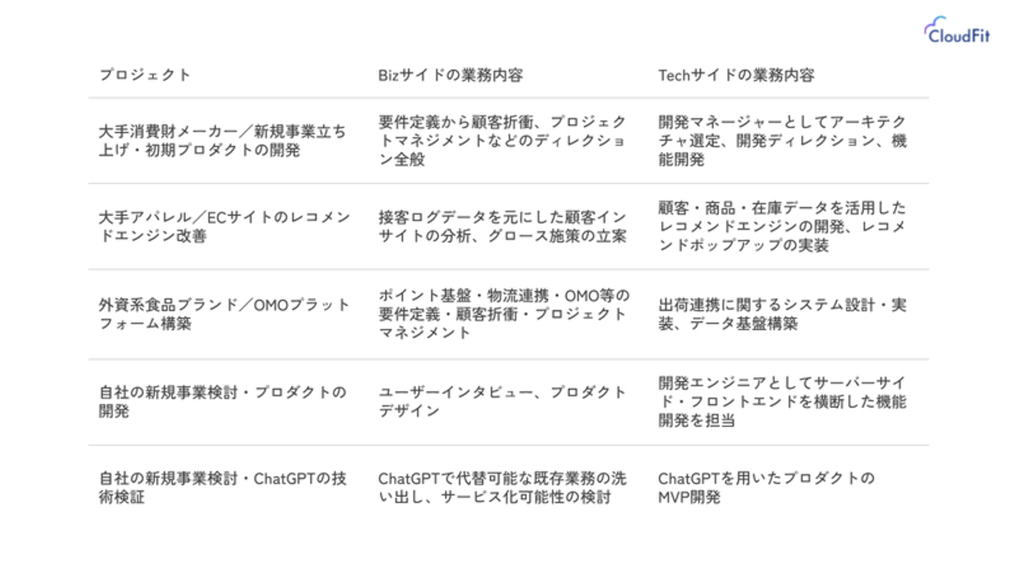 下記の表に参画したプロジェクトと、その中でBiz,Techそれぞれの観点で何を行ったのかについて整理しました。