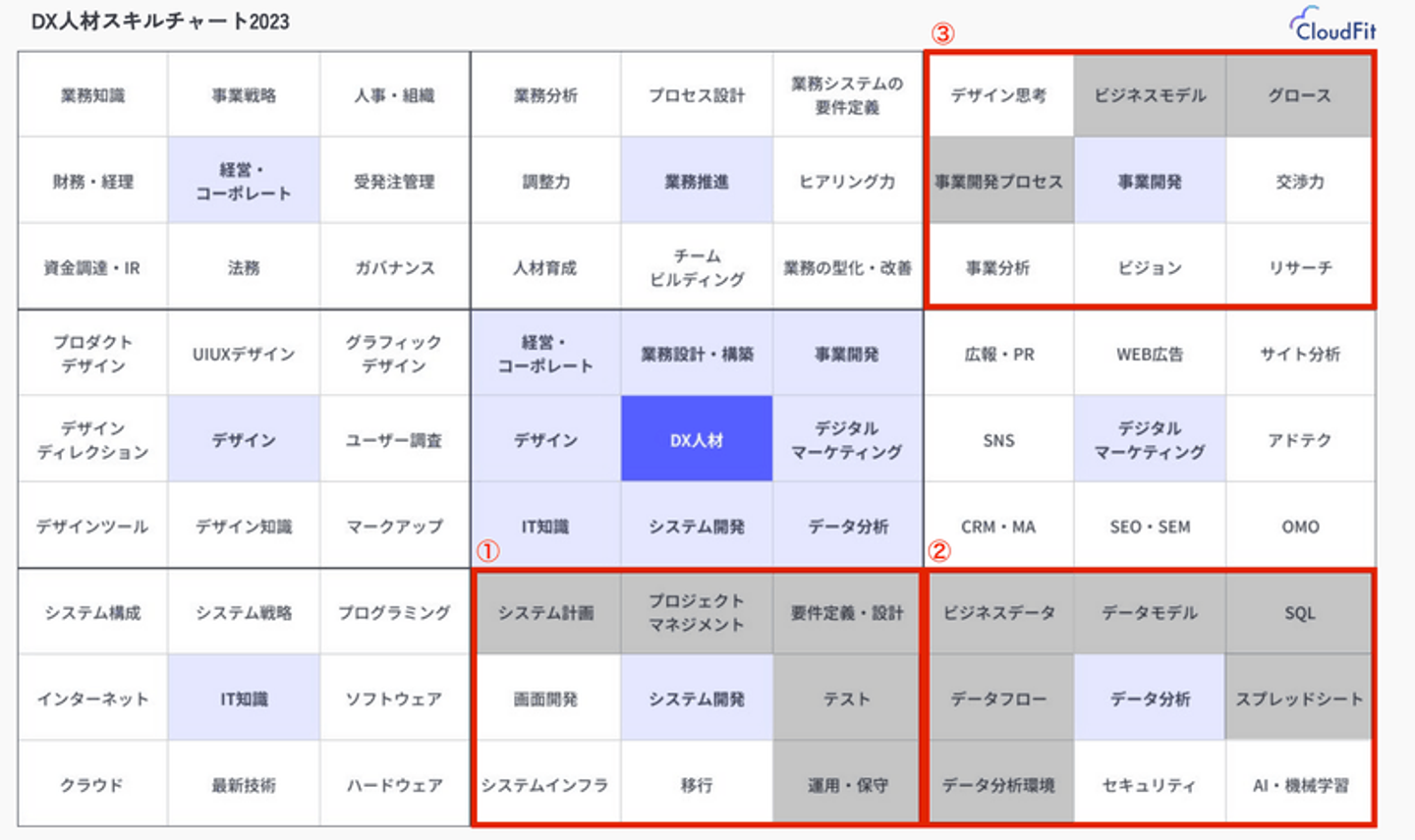 そのため現状のスキルを弊社が作成したDX人材スキルチャートを用いて棚卸しをして、どのような状況であれば最も価値を発揮出来るのかを整理していきます。現状であれば下記のスキルはある程度身につけています。