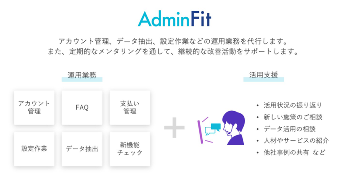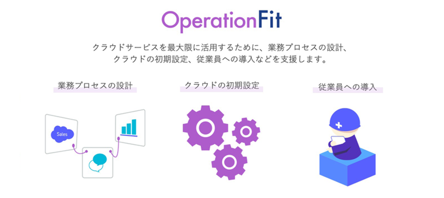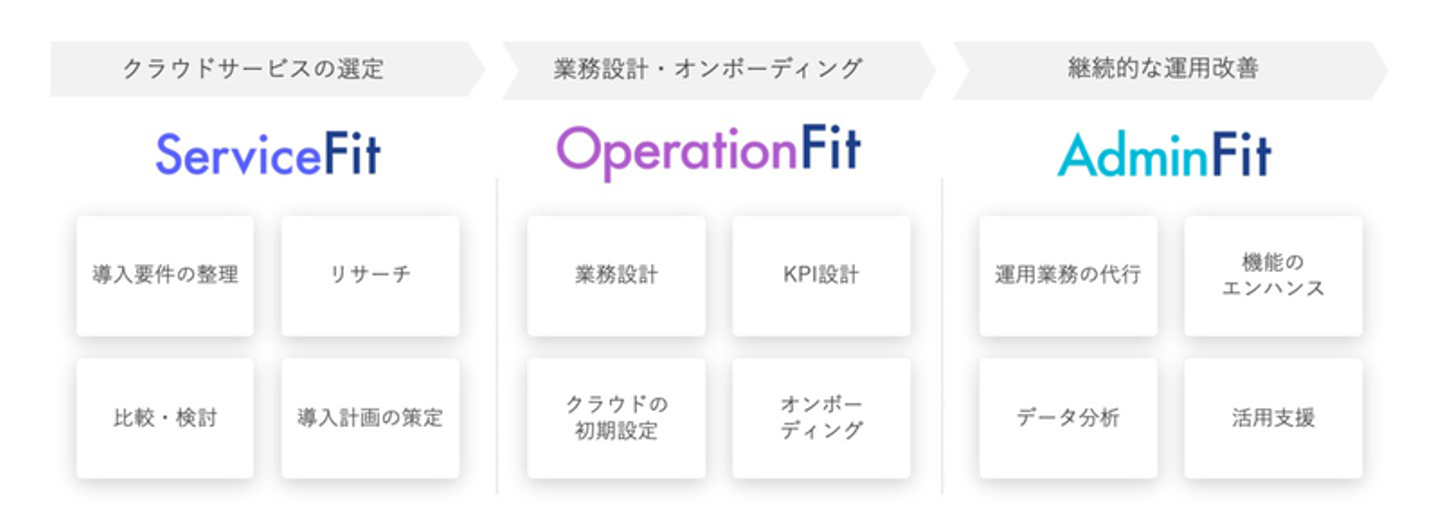 CloudFitではクラウドサービスによって推進される業務の設計、エンドユーザーとなる従業員に対するオンボーディング、運用フェーズでの継続的な改善活動を支援することで、ビジネス・業務視点でのクラウド活用を支援します。