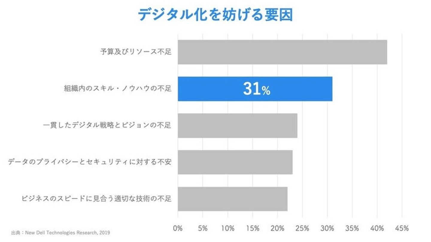 この状況は非常に喜ばしいことではありますが、進化のスピードが早いあまり、使い手である人側が進化に追いつけていない状態が生まれつつあると感じています。特に日本ではテクノロジーそのものではなく、組織内にそれを扱える人材がいない・ノウハウがないことがビジネスのデジタル化を妨げる要因になっていることが様々な調査で明らかになっています。