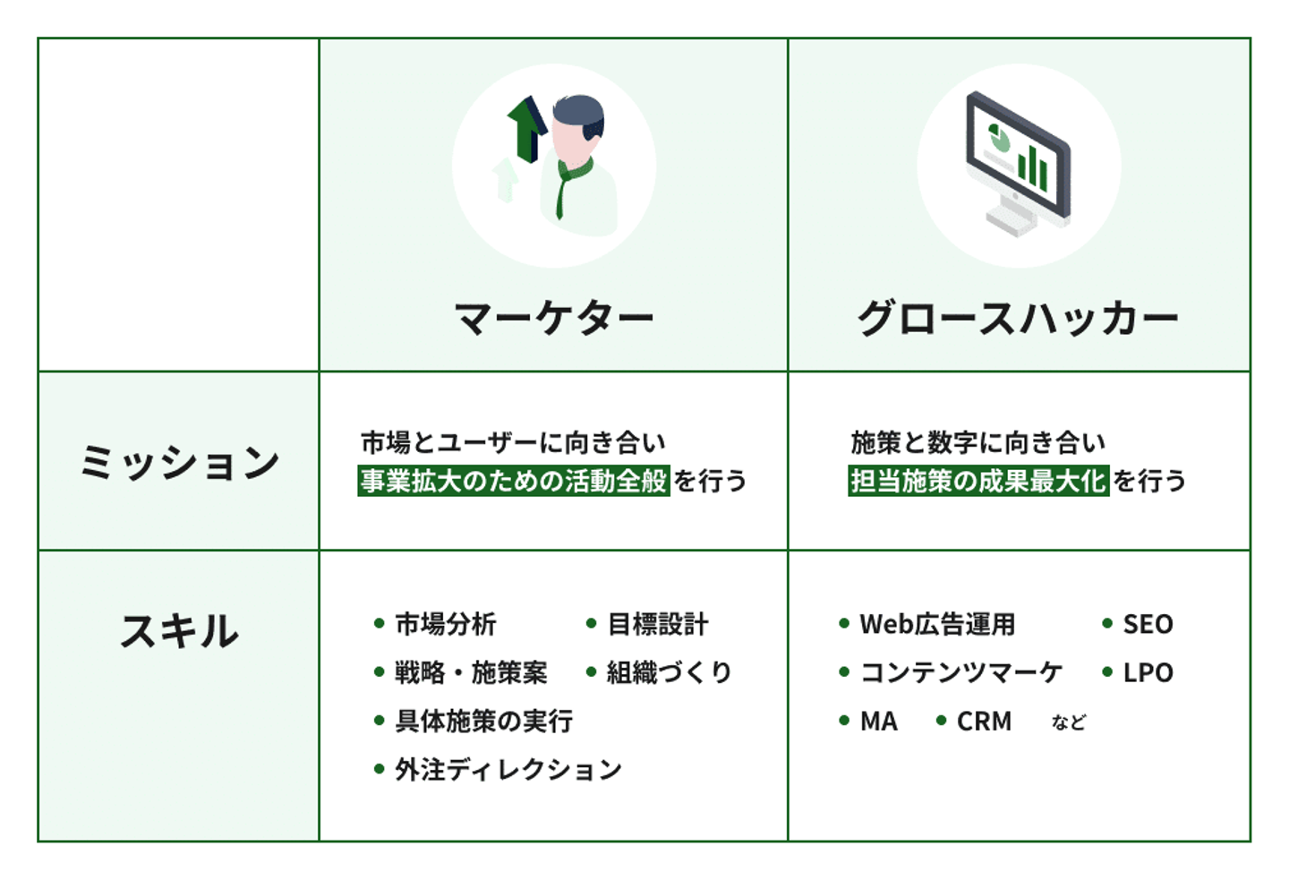 本当はグロースハッカーだけど、そんな役職やポジションはないので、マーケターとして見られてしまうのです。
