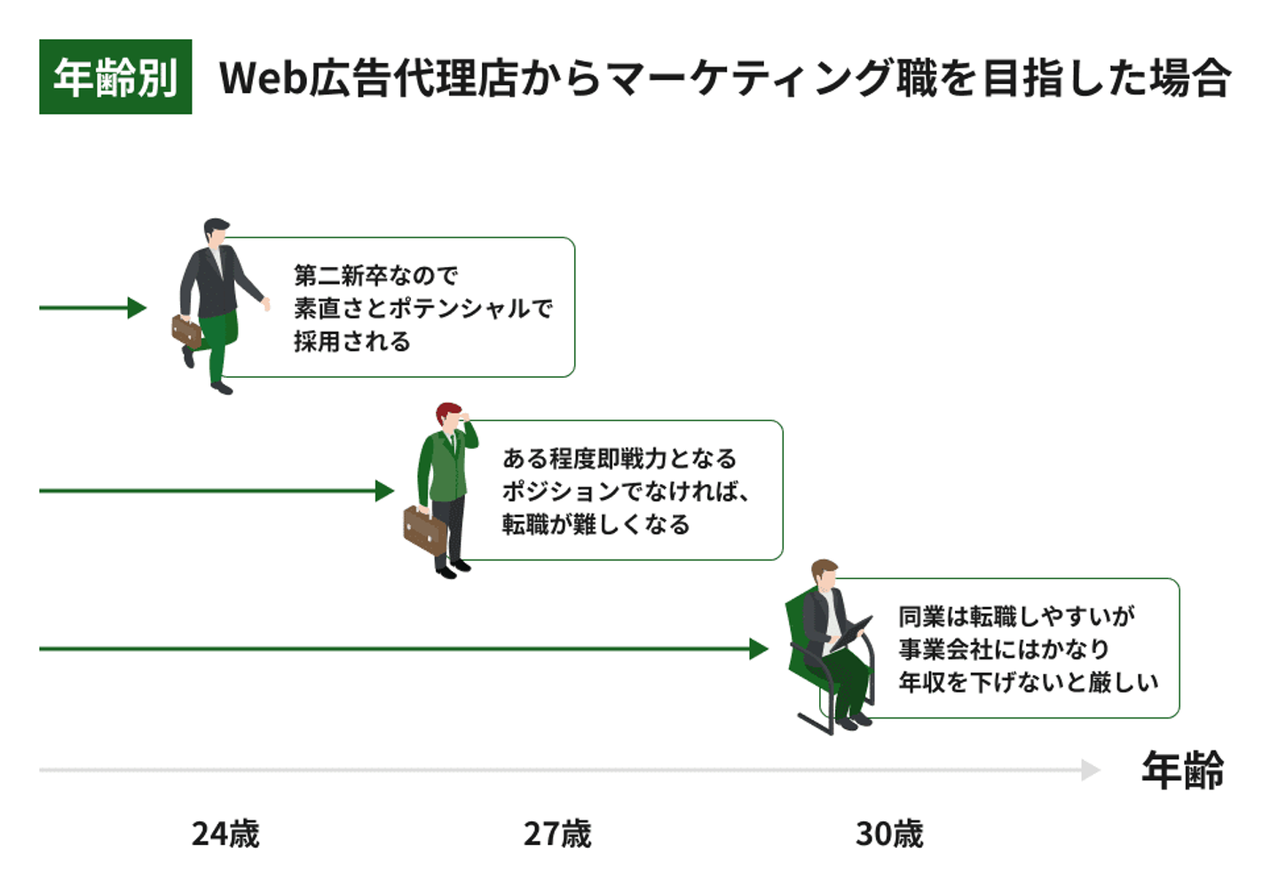 大手から創業期の代理店へ: 逆に、数人規模のスタートアップ代理店に飛び込み、創業メンバーとして会社を創り上げていく面白さもあります。仕組みも組織も未成熟であり、それが逆にやりがいになります。やれる領域も広がるので、いい会社に巡り会えるといい転職になります。