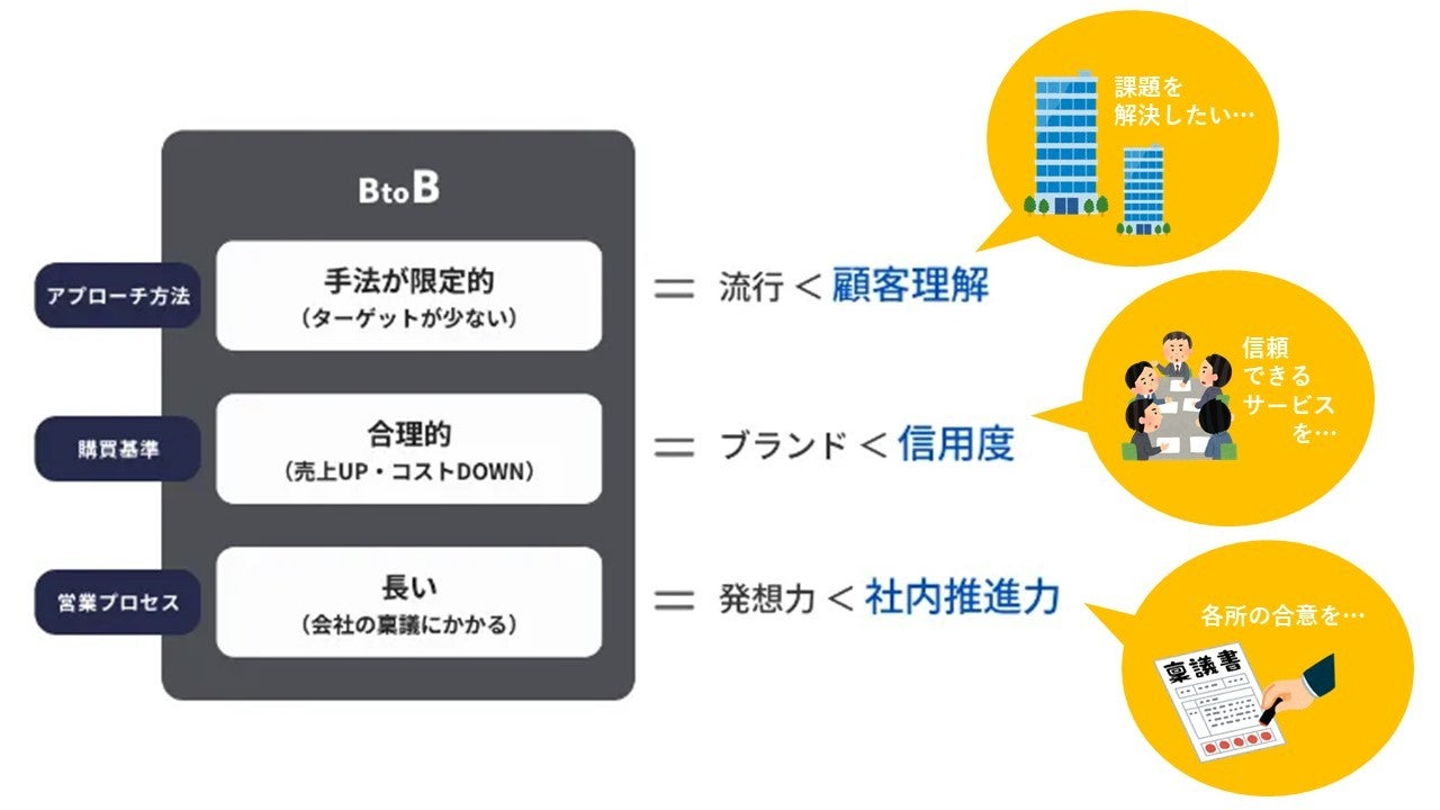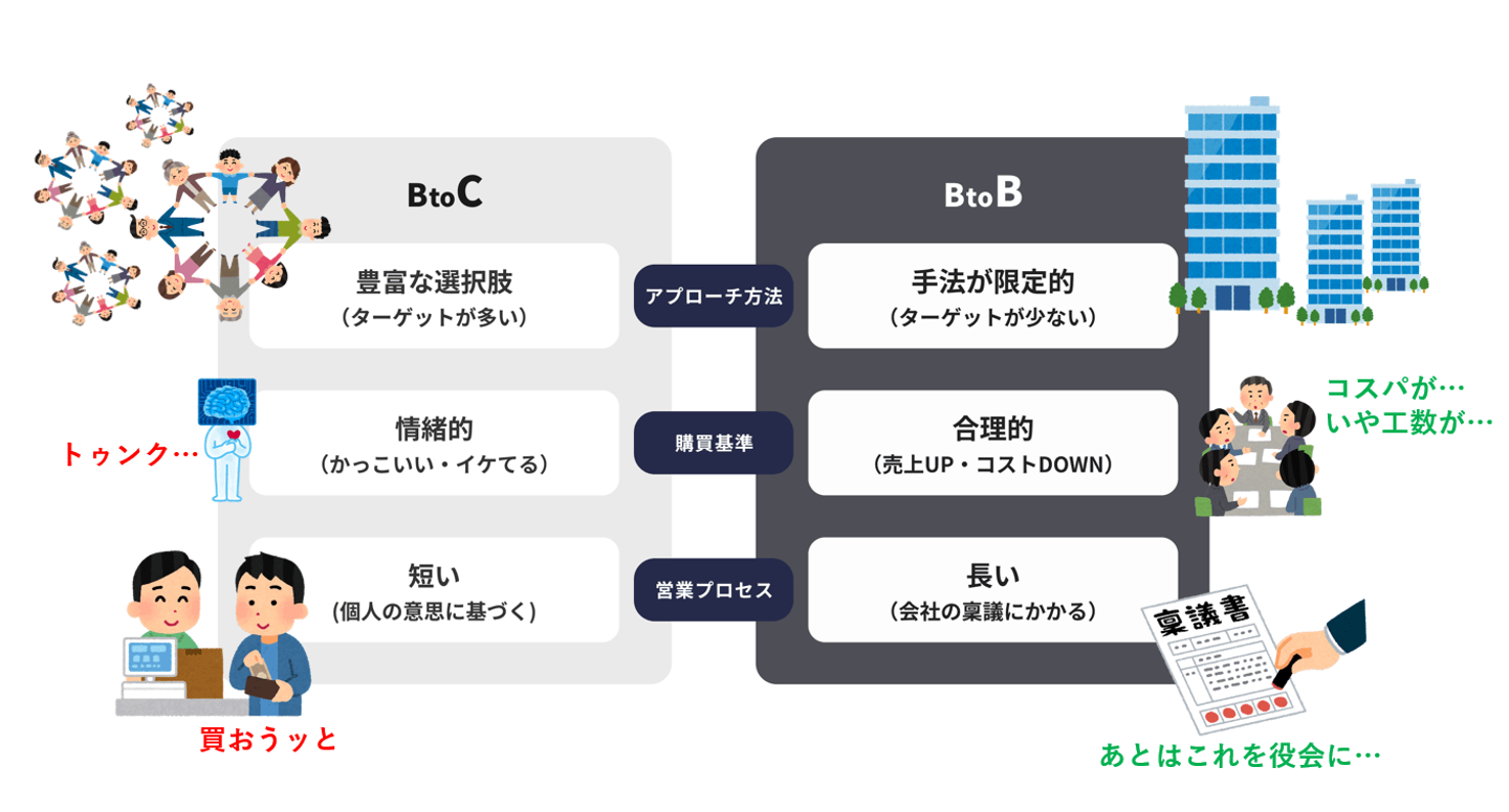 当たり前ですが、BtoBビジネスは、顧客が個人ではなく法人です。「なんかいい!」という感覚・感情だけでは購入決定しません。「コストメリットがある」「重要な課題を解決してくれる」という、合理的な基準で判断します。購入の意思決定をする判断基準が大きく変わるんです。