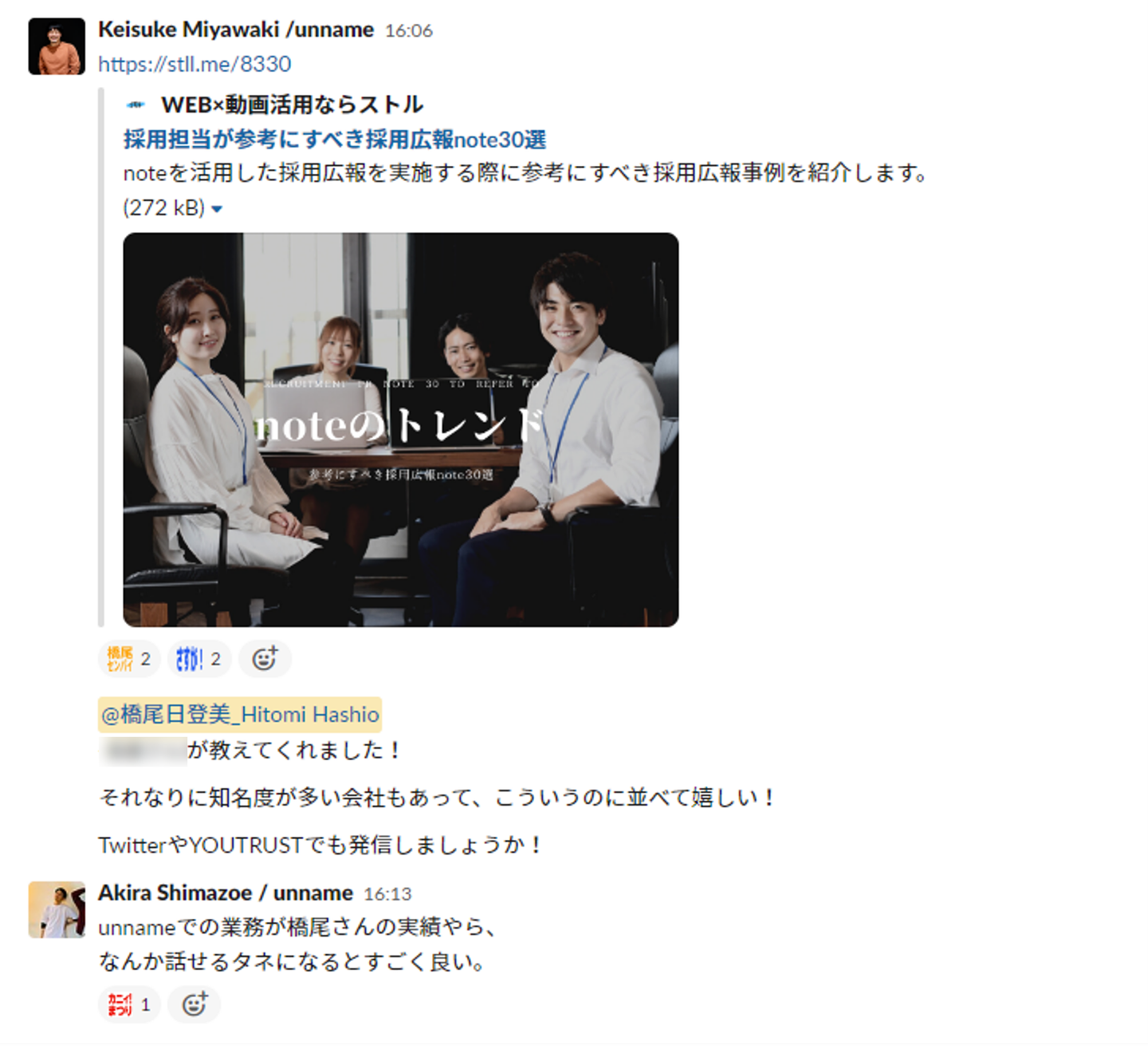 「橋尾さんの経験になることをしていいよ」と言ってくれるのが大きいかもしれません。これは「unnameという箱(会社)で、同じ目標を共に目指すと同時に、メンバーそれぞれ自己実現をして欲しい」という宮脇さんの考えが表れている部分だと思うのですが。