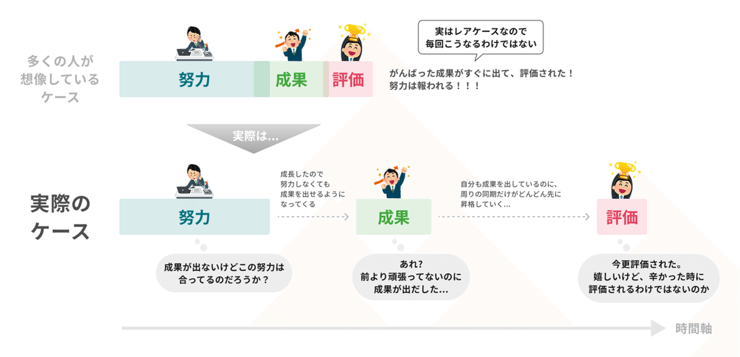 しかし、仕事の場合は成果と評価(昇格、昇給、表彰など)は必ずしも一致しません。もちろん評価されるには成果が必須ではありますが、そこには必ずタイムラグが存在しています。