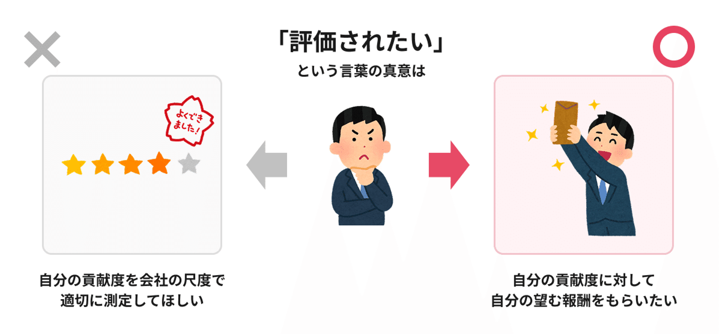 人々が願う「評価されたい」の評価は、正しく自分の貢献度を測って欲しいわけではなく、自分の貢献に対して、自分の望む報酬を期待しているということなのです。