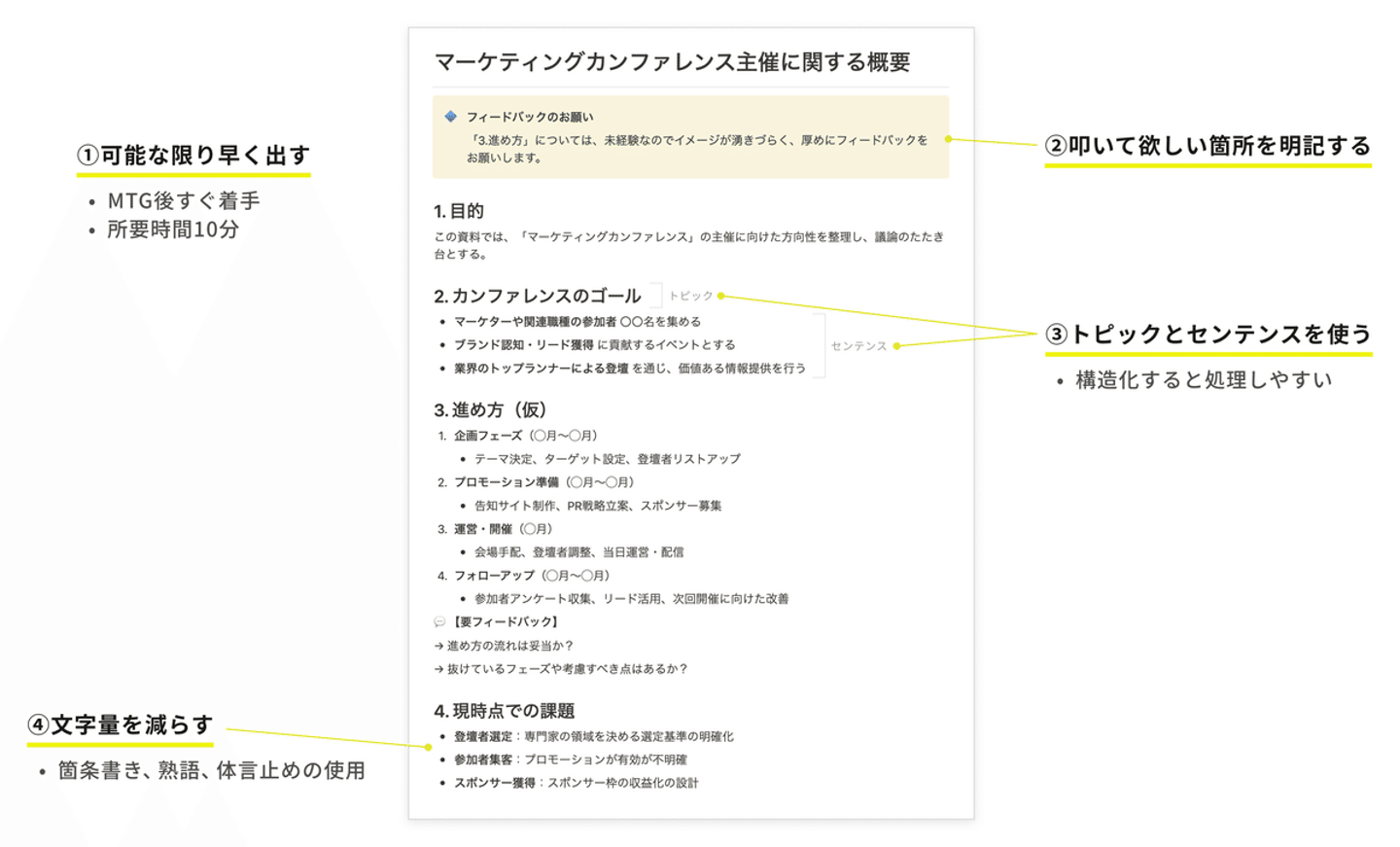 トピックとセンテンスを活用し、構造化しましょう。構造化すると、全体観を把握しやすく、MECE(重複や抜け漏れがない)かどうか、チェックしやすくなります。また、文章のみだと物理的にフィードバックしずらくなるので、そのためにも必ず構造化しましょう。
