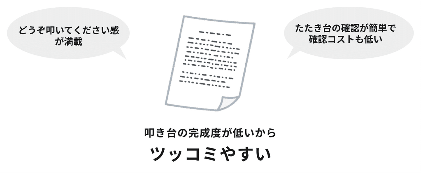 時間をかけない、期間を延ばさないことで確認側の期待値も低くなる。また、早く出てくると作成コストが低いと認識されるため、叩く側が心理的に叩きやすくなる。最大のポイントとしては、自分の中での完成度を高めないこと。完成度20%くらいの気持ちで作ると最も余白のある、叩き甲斐のあるたたき台になります。