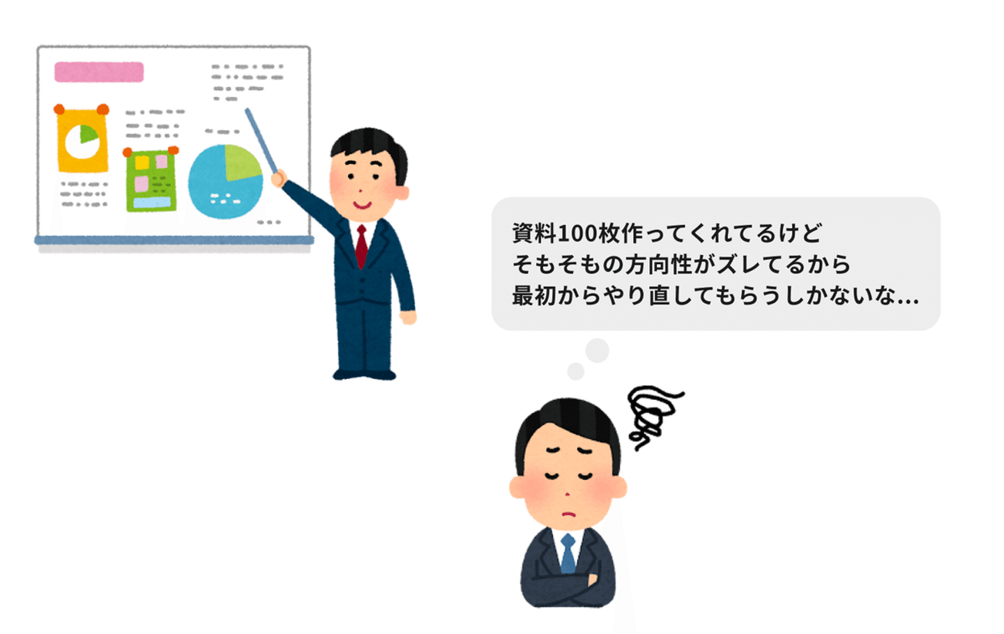 こういう不幸を生まないためには、20~30点程度の出来栄えで一度共有するクセをつけましょう。自信がない、イメージが湧かなさすぎる場合は、「たたき台のたたき台」を作ってもらっても良いかもしれません。企画書でも提案書でもテキストでも「いったん骨組み作ってみました」「箇条書きレベルですが」と土台の段階で渡してみることです。