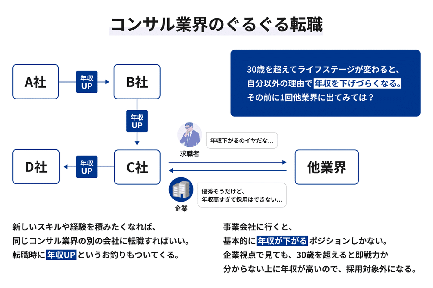 年収がかなり上がったC社のタイミングで他業界に転職しようとしても、転職しない理由が多すぎてまたコンサル業界で転職をぐるぐる繰り返してしまう