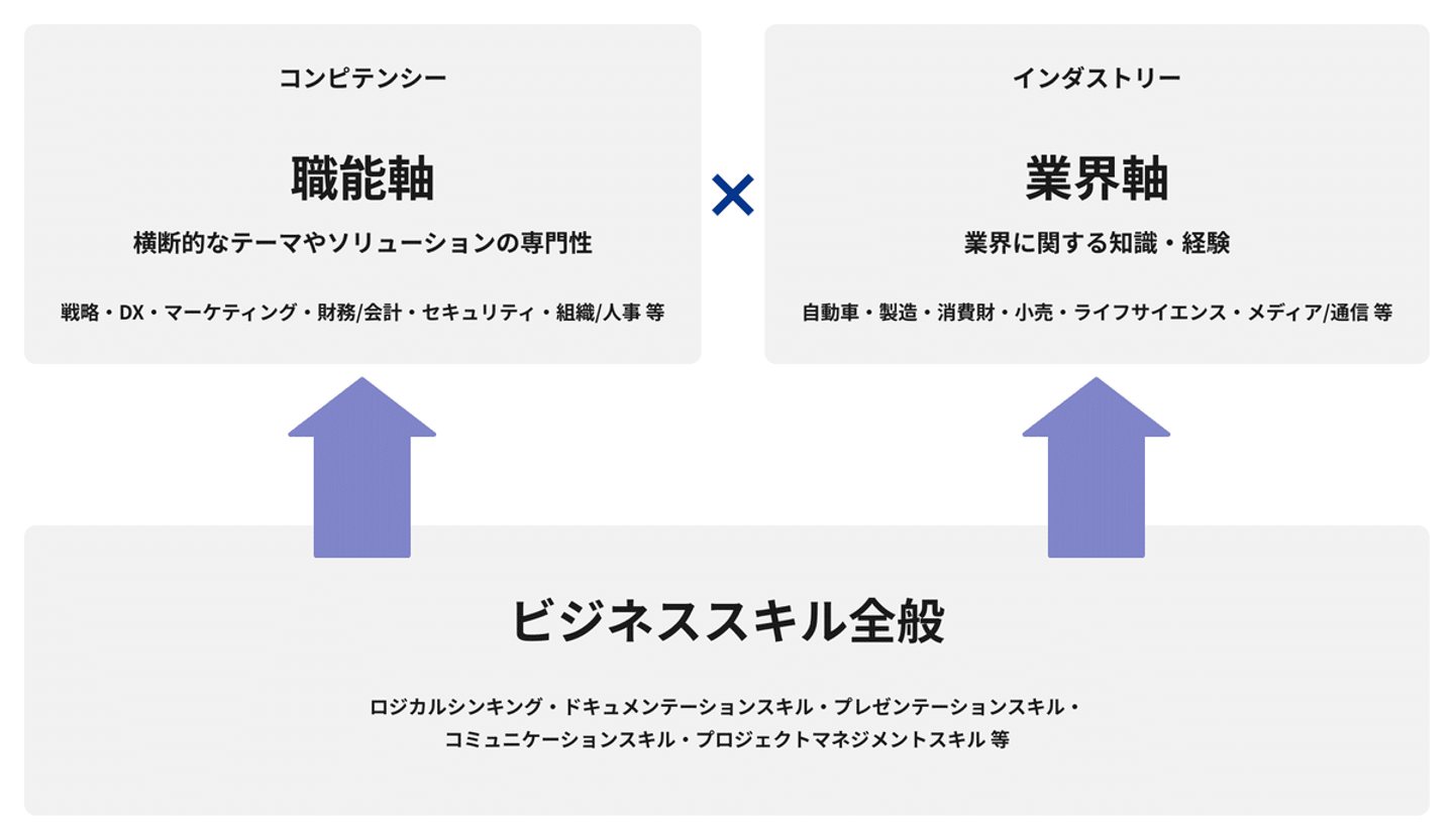 特に大手のコンサルティング業界でキャリア的に得られにくいものとして、「職種・職能」と「業種・業界」を横断的に経験をしていく部分です。