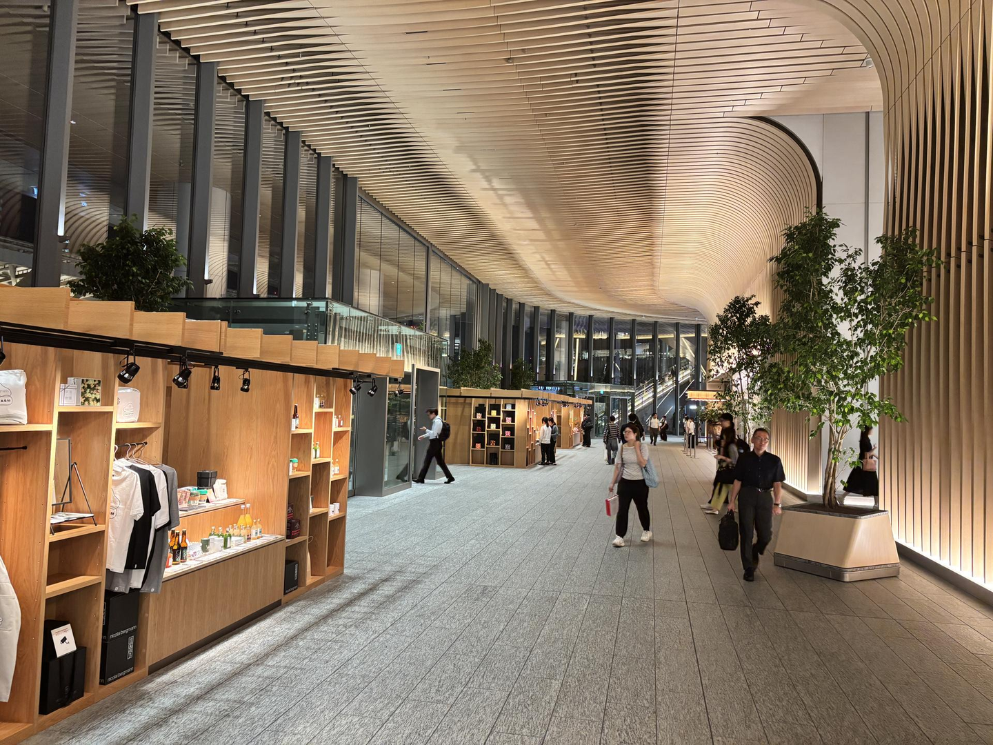 高い天井と木目調を基調とした内装が、まるで美術館や高級ホテルのロビーのような落ち着いた雰囲気を醸し出しています。特に、商業施設内の通路は広々としていて、ショーケースのような設計のショップが並びます。オフィス街の喧騒から一歩足を踏み入れるだけで、心がリセットされるような感覚。仕事で集中モードだった頭が、自然とリラックスモードに切り替わります。