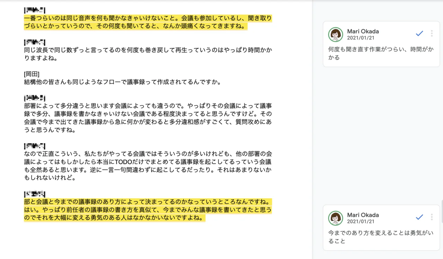 【ヒアリング結果】ヒアリングは文字起こしを行い、気になる文章はピックアップ