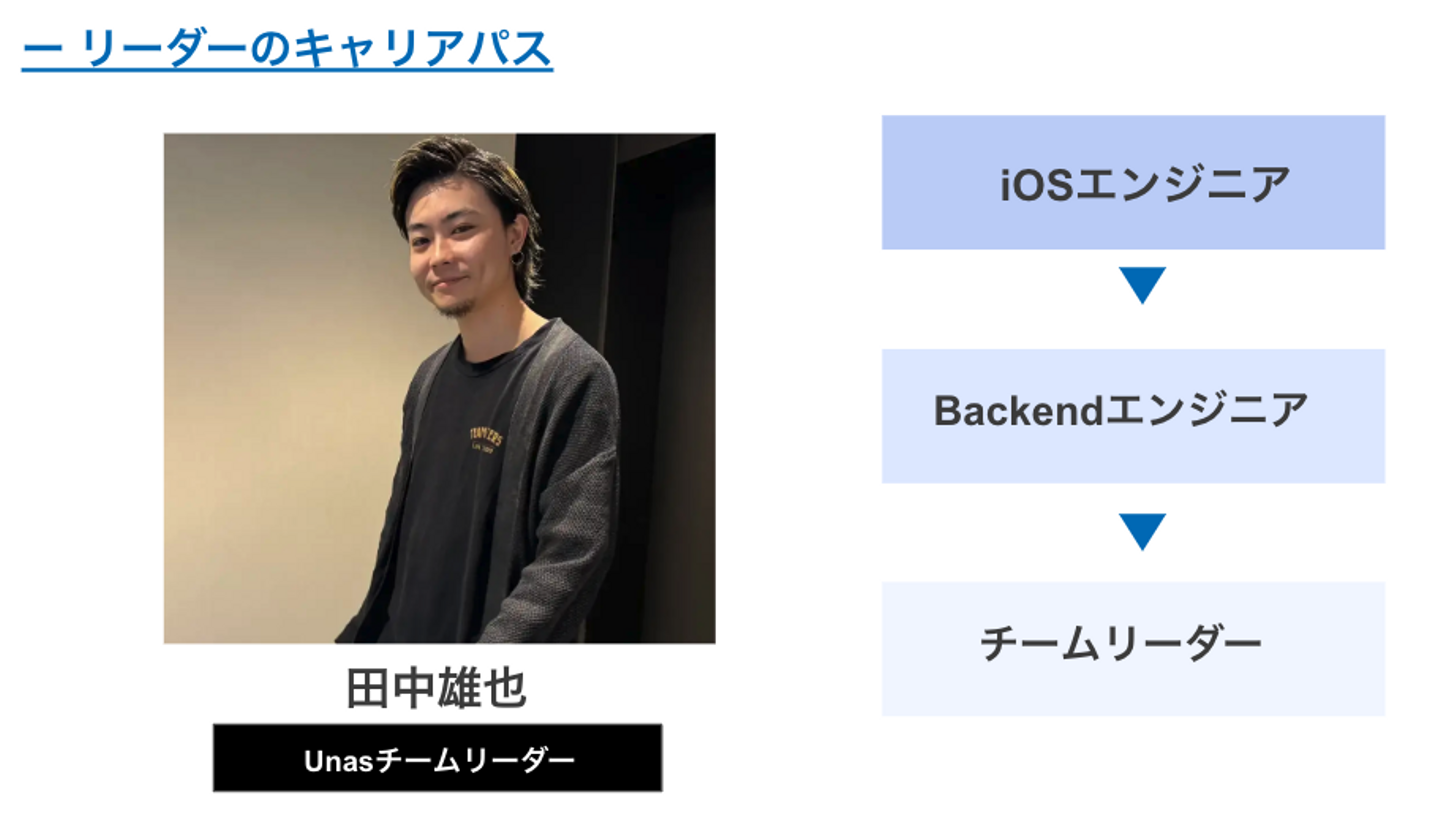 田中さんはiOSエンジニアのあとにBackendエンジニアにステップアップし、現在では1プロジェクトのリーダーを担っており、チームの皆さんを引っ張ってくれています!