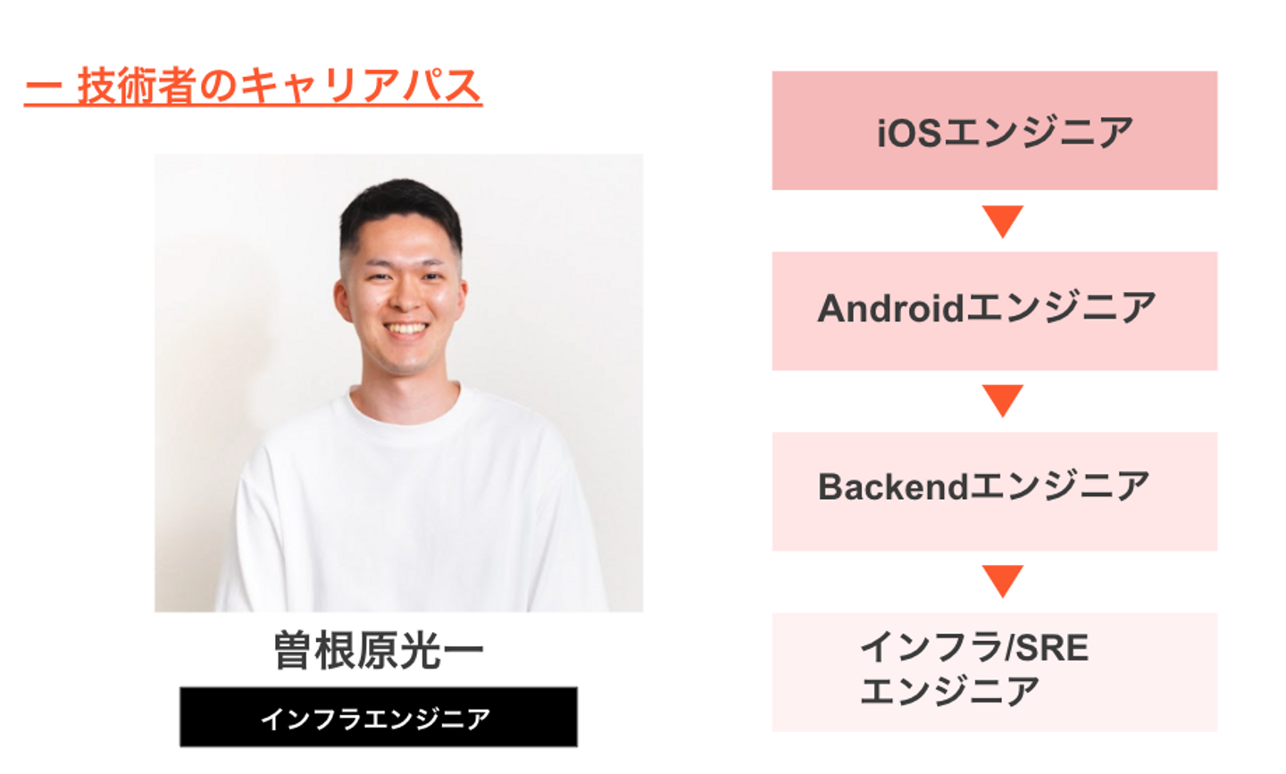 曽根原さんは入社後にiOSエンジニアとして開発を行っていましたが、ステップアップし現在ではマルチにこなせるインフラエンジニアとして会社を支えています!
