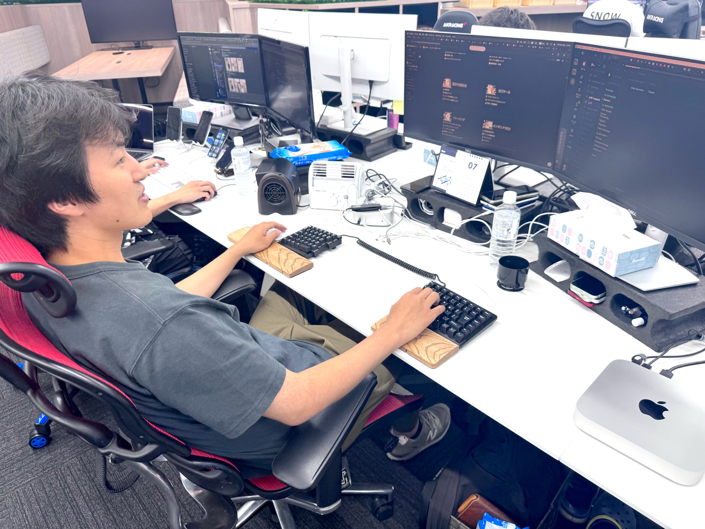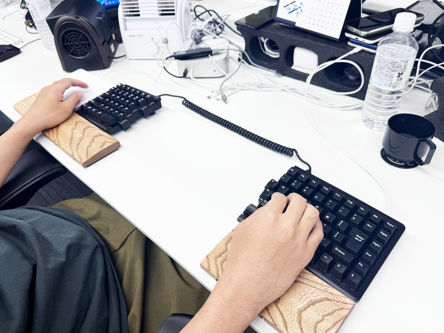 肩幅が広めなので、普通のキーボードだと腕の位置が窮屈になってしまうんですよね。前のオフィスは特に席が狭くて、遠めに座れば解決するんですけど後ろが狭くてどうしても前に詰めるしかなかったんです。そこで、腕を広く取れる分離型のキーボードを選びました。