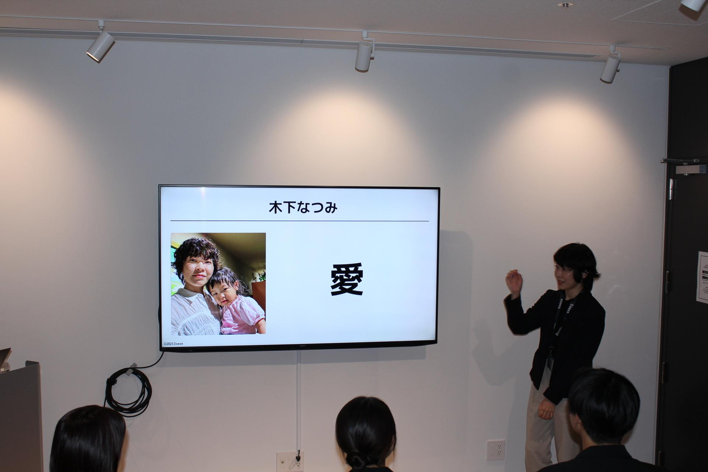 ▲26年卒内定式の写真(木下さんが自分を表現する一言について発表)