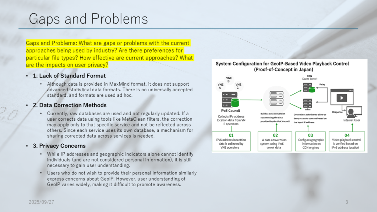 最後に日本でのIPv4アドレス共有の仕組みや実態について紹介し、アドレス共有の問題点として、エンドユーザーを特定するためには、IPアドレスだけでなくポート番号とアクセスする時間が必要となり、地理情報が不正確になっていることを説明しました。IPv6アドレスへの移行により、この問題へ対処することがよいのではないかとの意見を表明してきました。