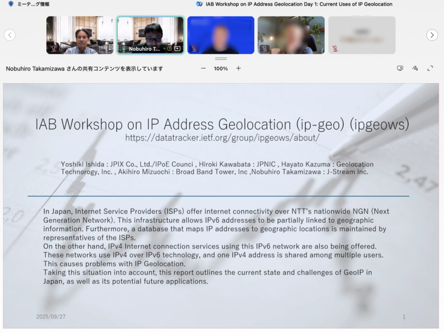今回参加したのは「IAB Workshop on IP Address Geolocation」というワークショップで、オンラインですが3日間の発表と議論が行われました。参加者はMaxMindなどの地理情報を提供している会社、AkamaiやCloudflareなどのCDN事業者、地域レジストリなど、幅広いメンバーが参加していました。