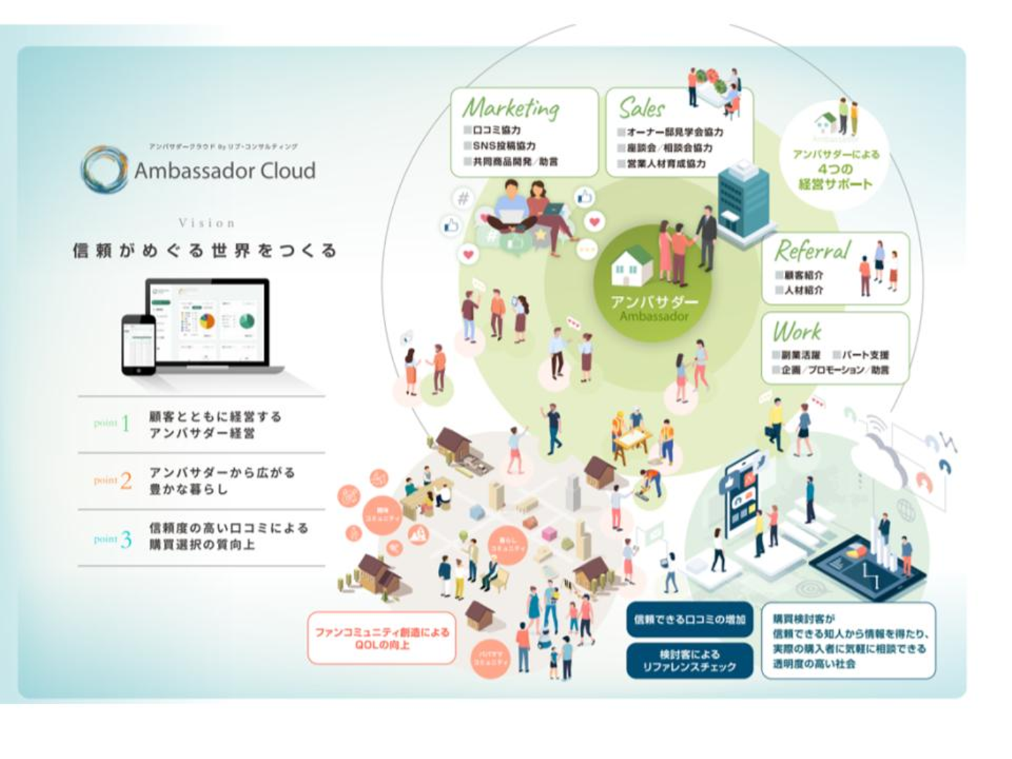 自社を愛する顧客=ファン(アンバサダー)が発信する質が高い情報から、消費者がより最適な購入先を選べる世界の実現、「トラストエコノミー(信頼経済)」という新たな世界観の実現を目指し、アンバサダークラウドは誕生しました。