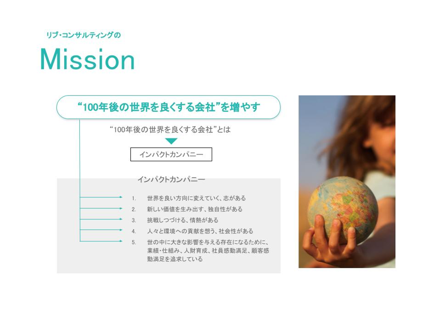 “100年後を良くする会社”を当社独自の言葉で『インパクト・カンパニー』と名付けており、展開する事業やサービスによって世の中に“Before ⇔ After ”のインパクトを生み出すことができる企業のことを表しています。