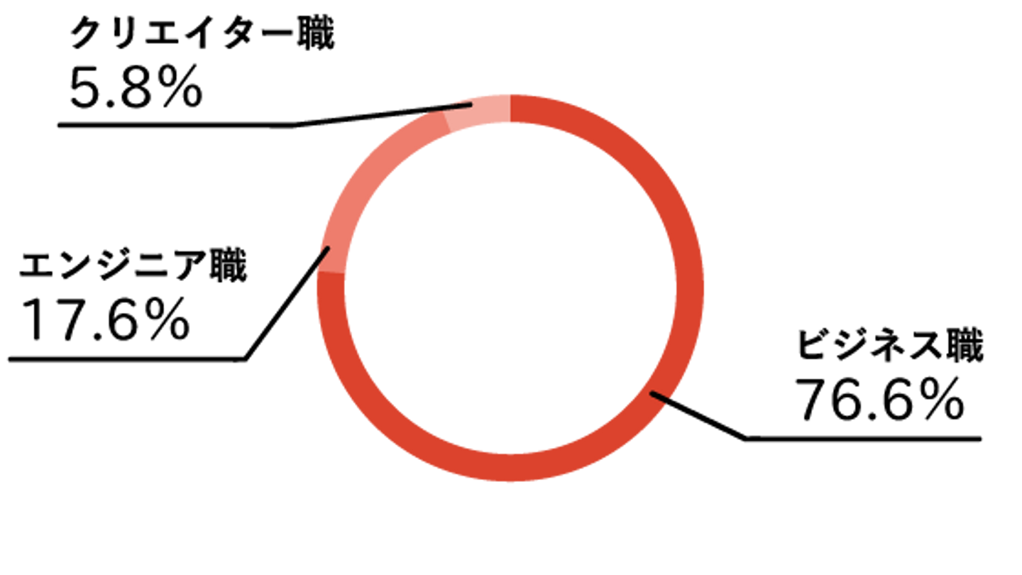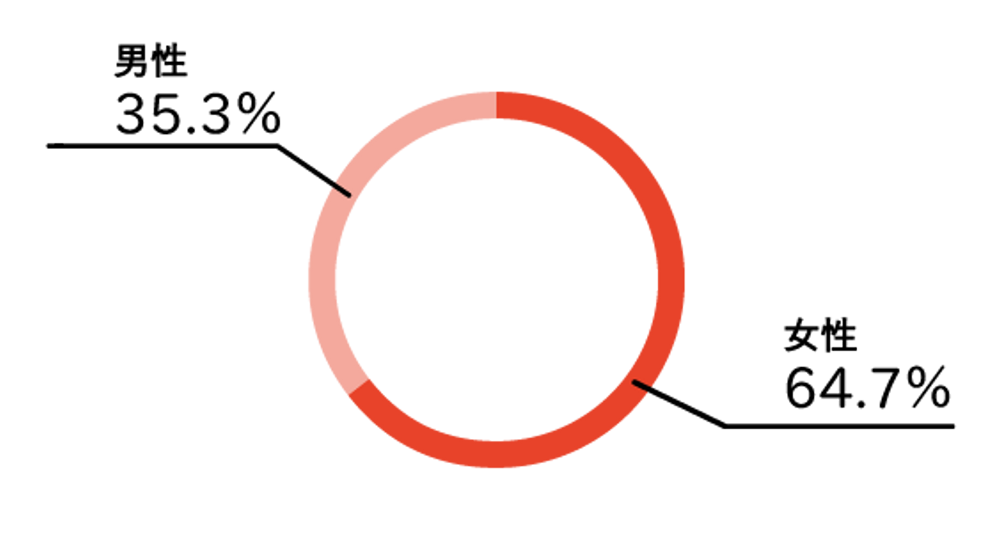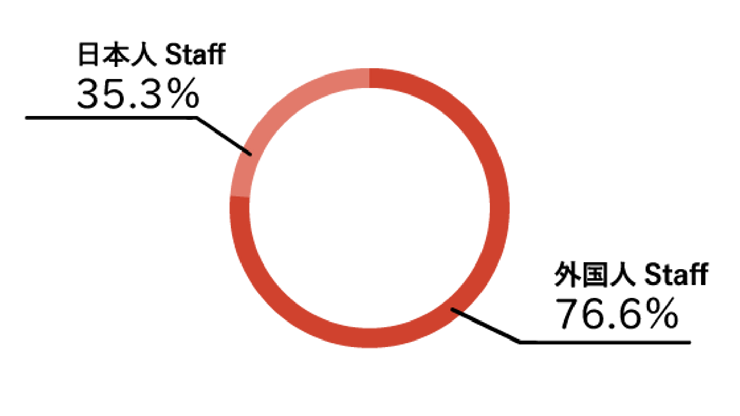 外国人スタッフが77%を占めるため、女性スタッフの構成比率が高くなっています。